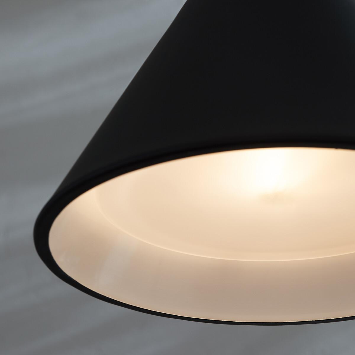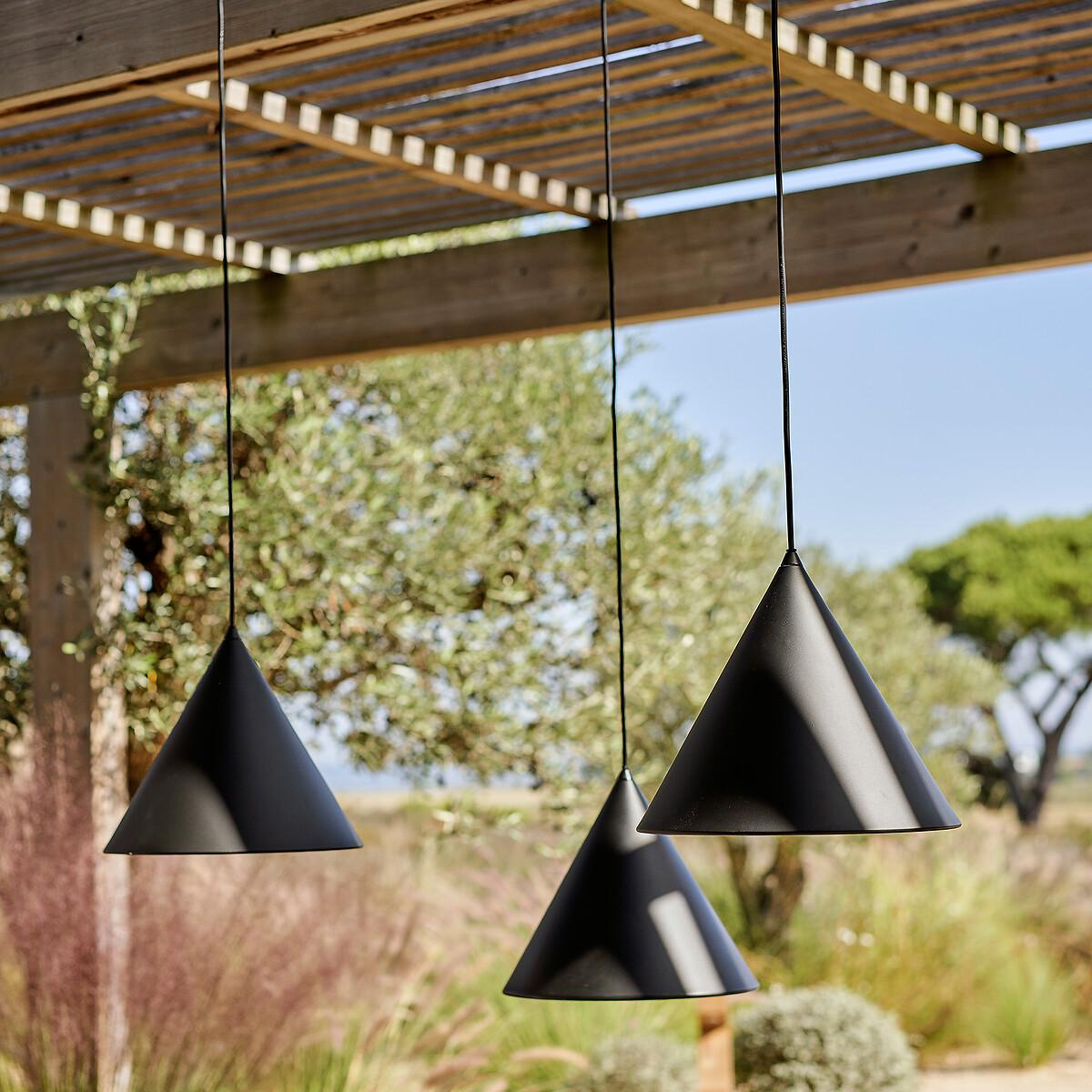 Aesthetics, refinement & sobriety. The Moke range is part of the AMPM Iconics: exclusive creations, anchored in the brand's DNA.With a sculptural, radical and timeless aesthetic, the Moke metal pendant light is available in an outdoor version. Product Details • Iron with black epoxy finish • Slightly rolled edge iron finish= • Internal frosted glass diffuser • Epoxy-finish iron support and base • Conical reflector, white epoxy interior • Adjustable height • E27 socket holder, 8W LEDQuality Info • The IP54 standard guarantees reinforced protection against splashing water. Lights bearing this standard are suitable for damp rooms or for outdoor use..Dimensions • Cone: Diameter 30 x Height 24.7cm • Internal glass diffuser: Diameter 26 x H14cm • Max cable length: 1200cm • Ceiling plate diameter 10cm. Thickness: 2cm. Dimensions and weight of parcel 1 parcel • 35 x 35 x 30cm 3.2kg