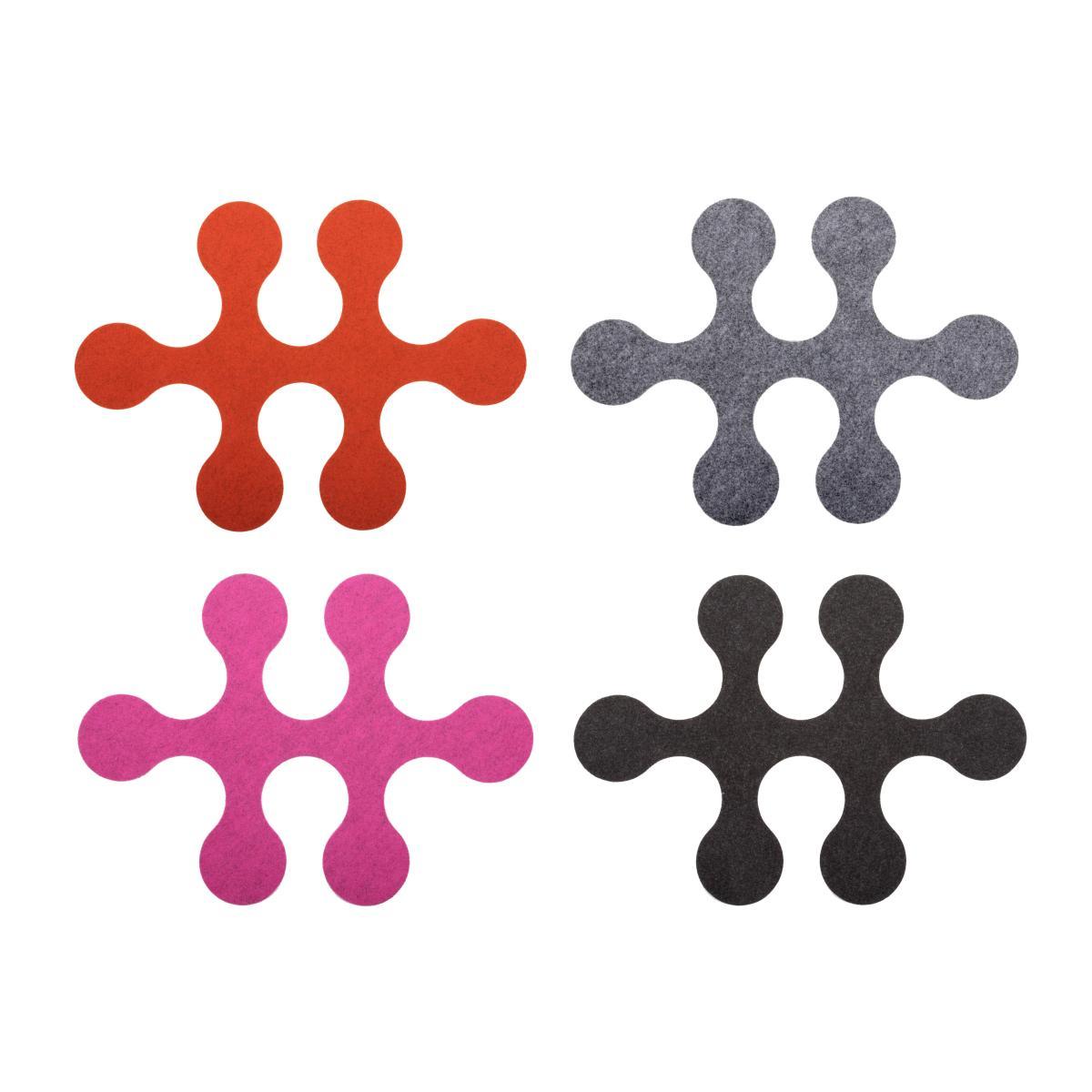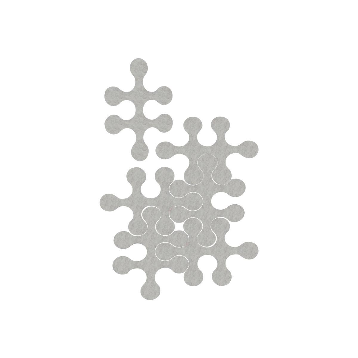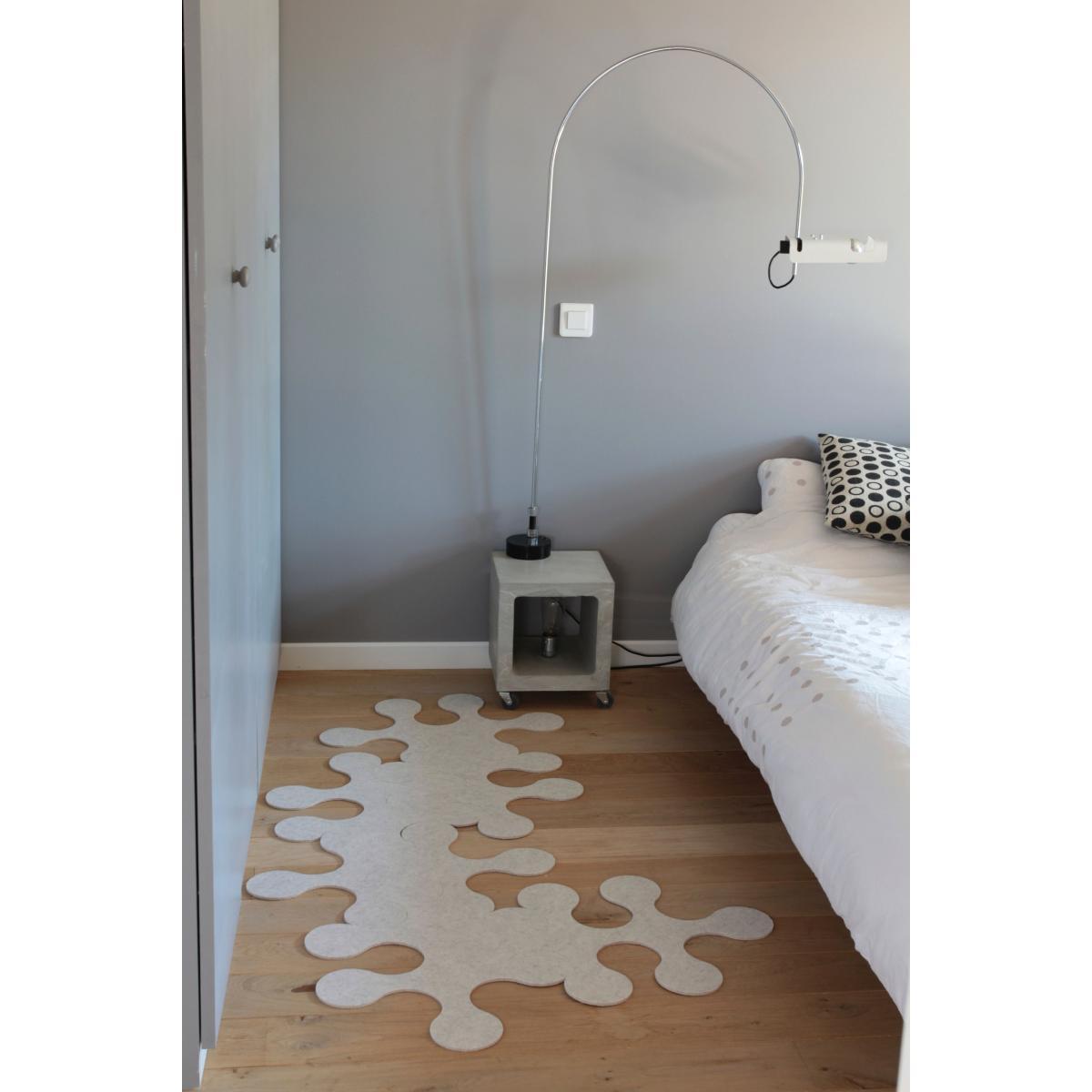 Rugs comprised of various puzzle-shaped pieces. 100% recycled felt (6, 12 or 24 pieces of solid colours: light grey, anthracite, orange and fuchsia). These pieces can be nested in every direction for a multitude of possible combinations.