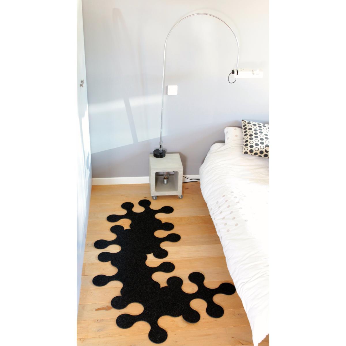 Rugs comprised of various puzzle-shaped pieces. 100% recycled felt (6, 12 or 24 pieces of solid colours: light grey, anthracite, orange and fuchsia). These pieces can be nested in every direction for a multitude of possible combinations.