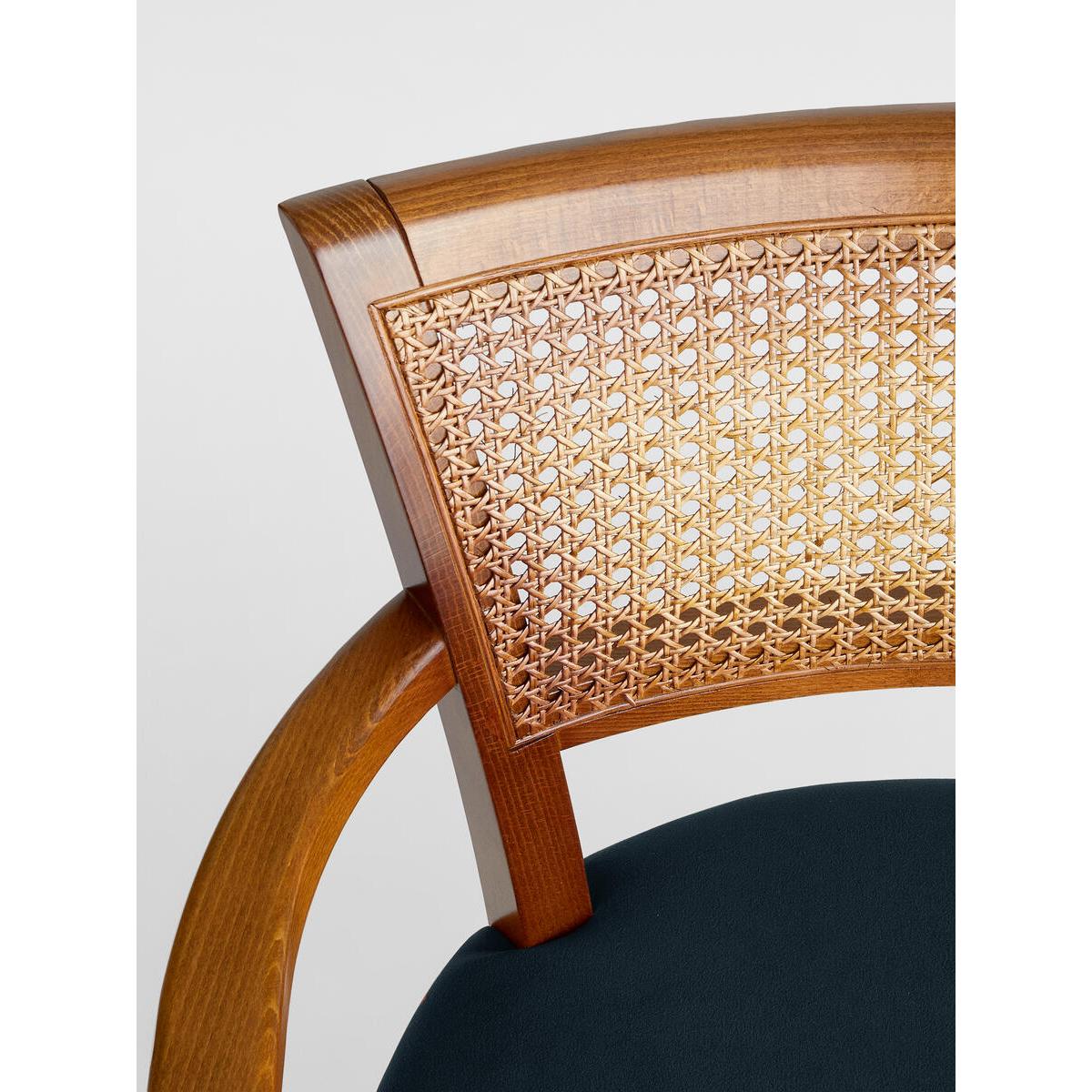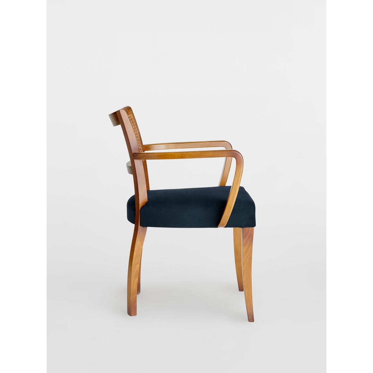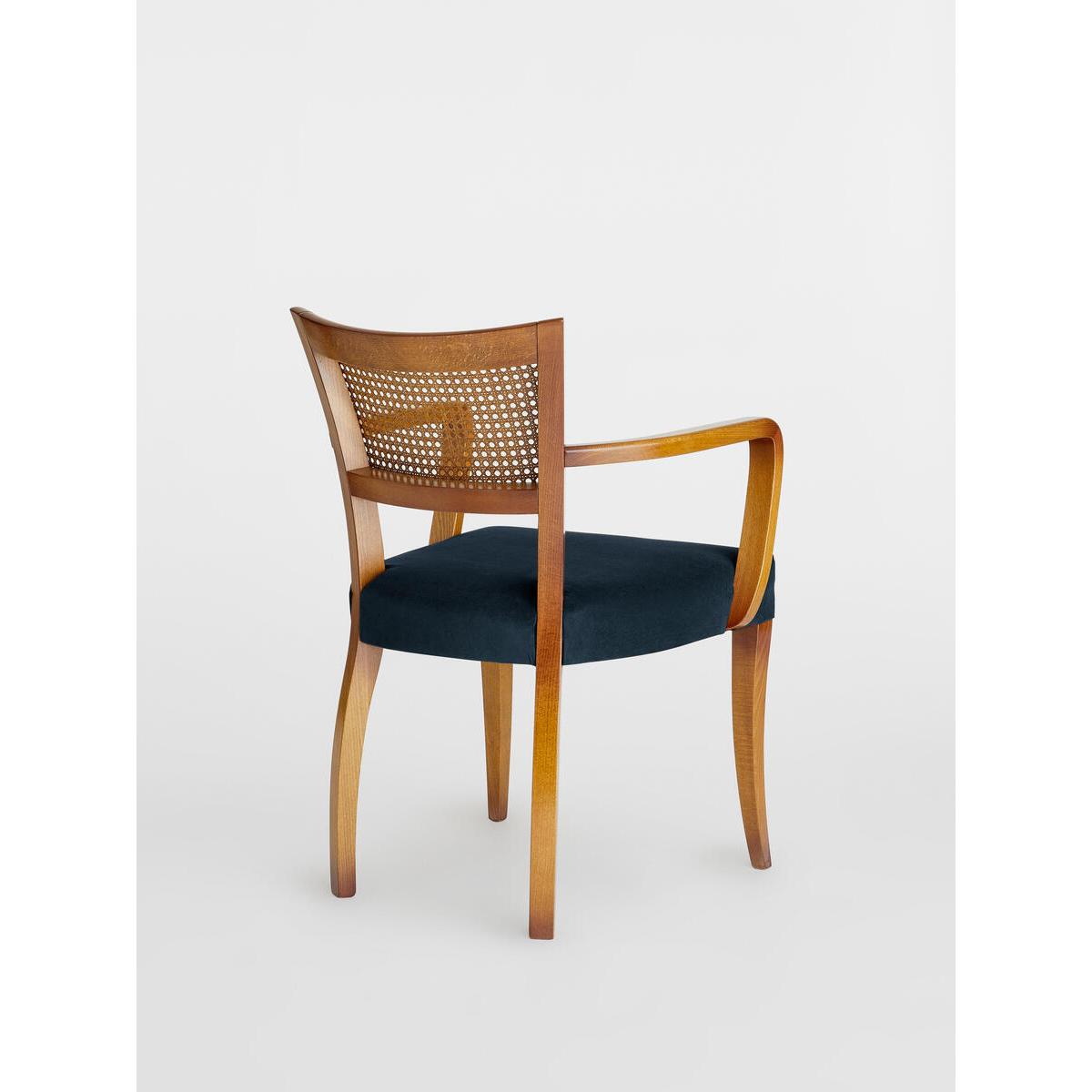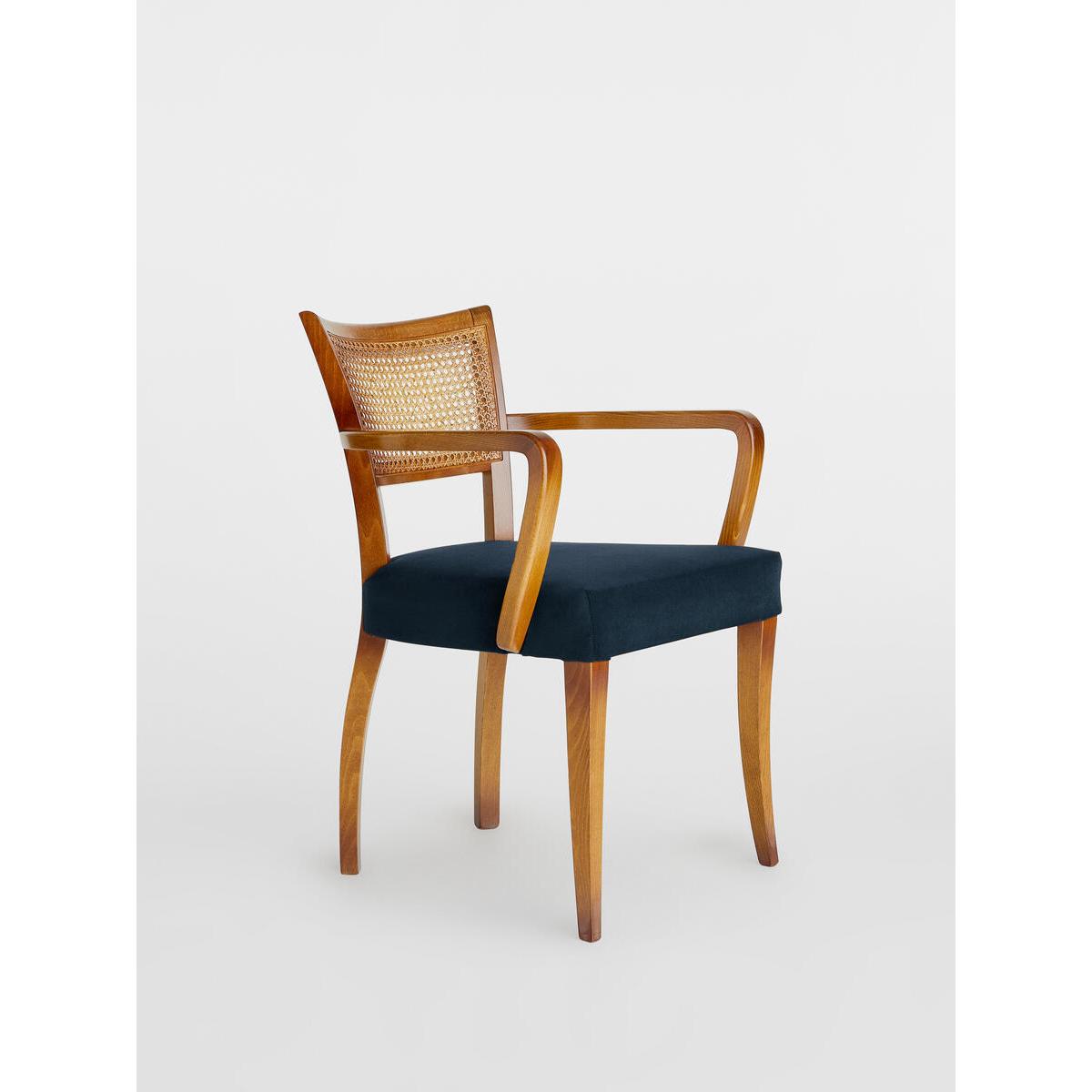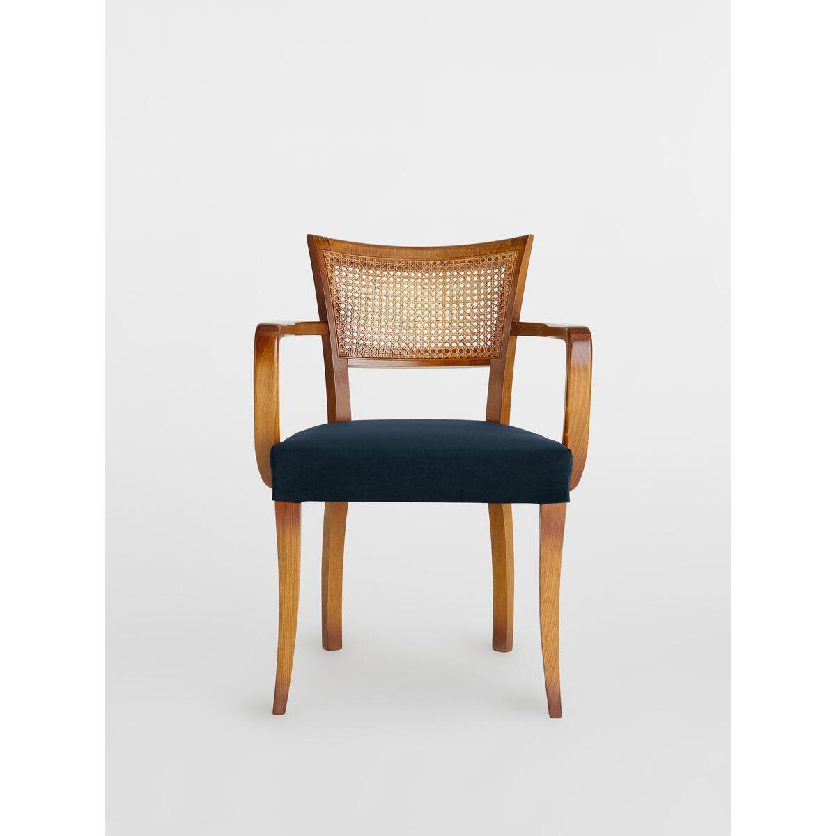 A House hero, you'll find our cane Molina armchair everywhere from High Road House to Soho House Berlin, as well as a vintage version in Kettner's Townhouse. The chair is made in Italy with a hardwood beech frame, cane back and is upholstered in cotton velvet. Dining chair with upholstered seat and cane back Curved wooden arms Upholstered in velvet Dark hardwood beech frame Inspired by the vintage dining chairs at Kettner's Townhouse