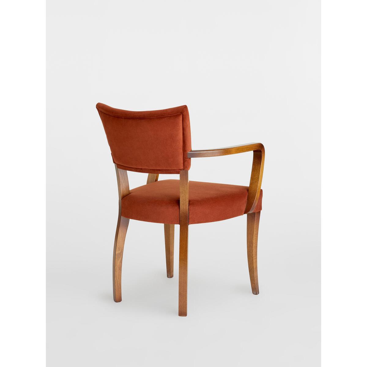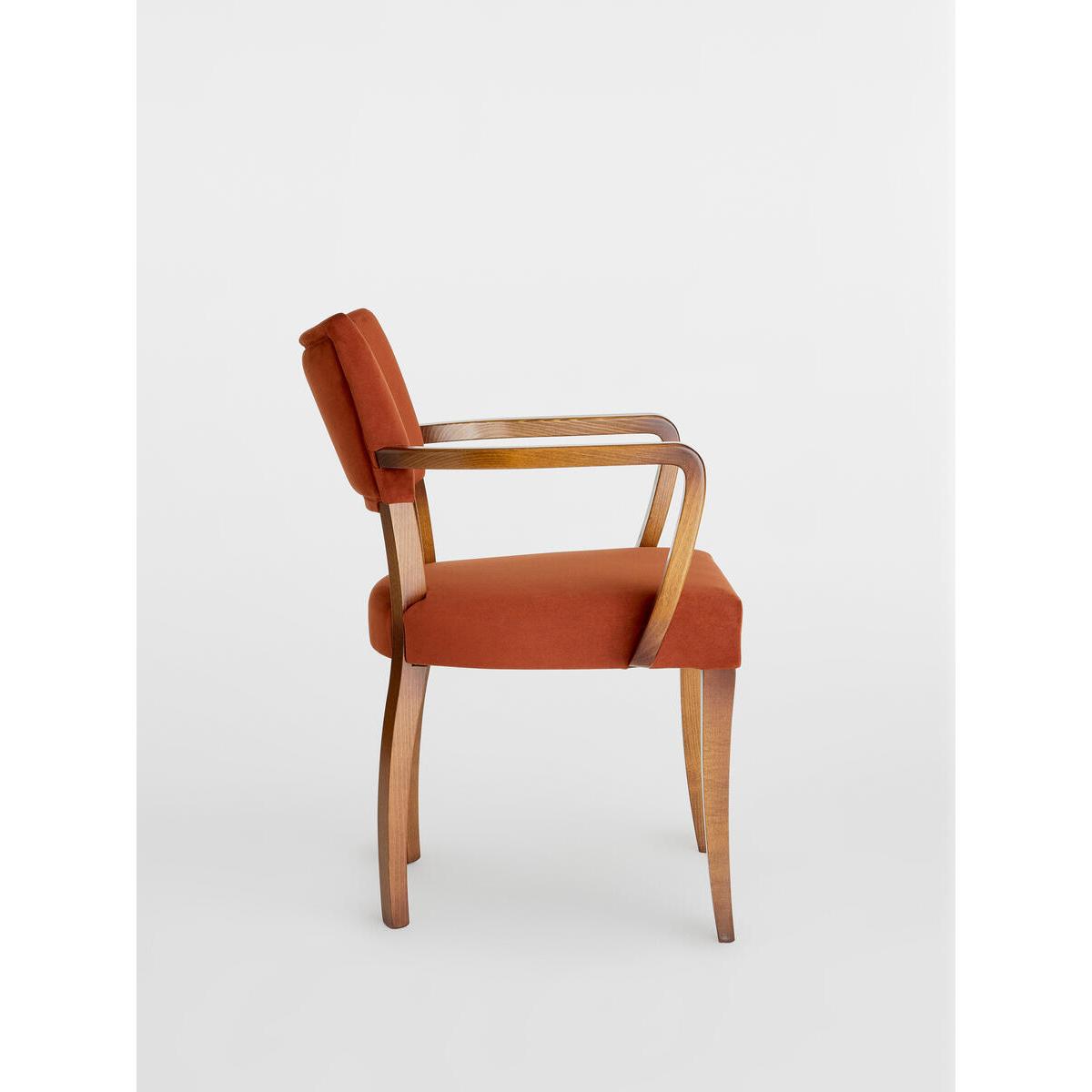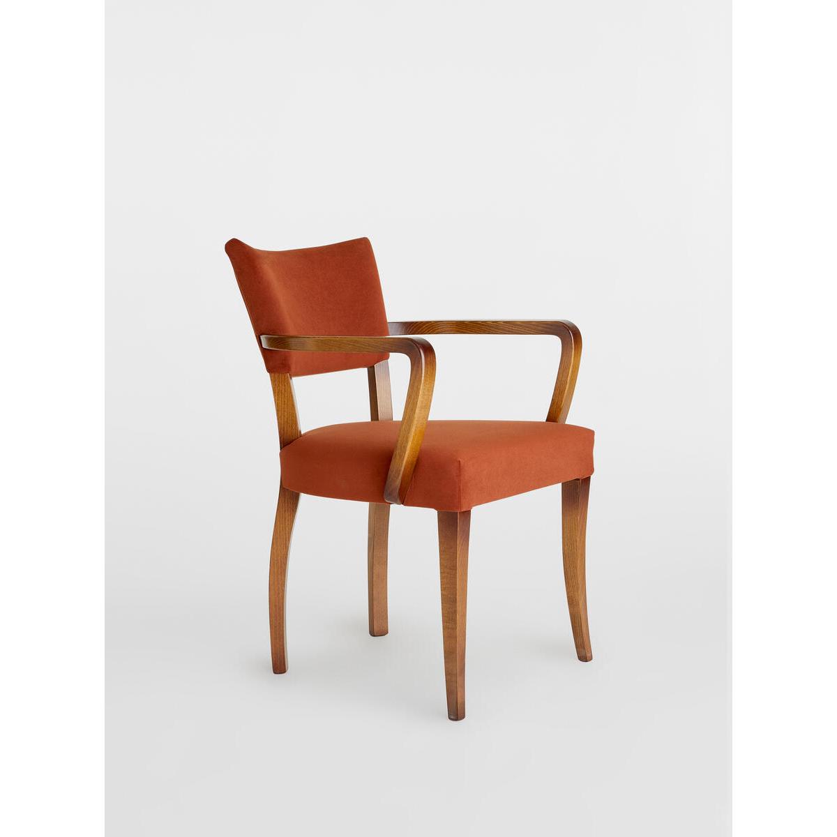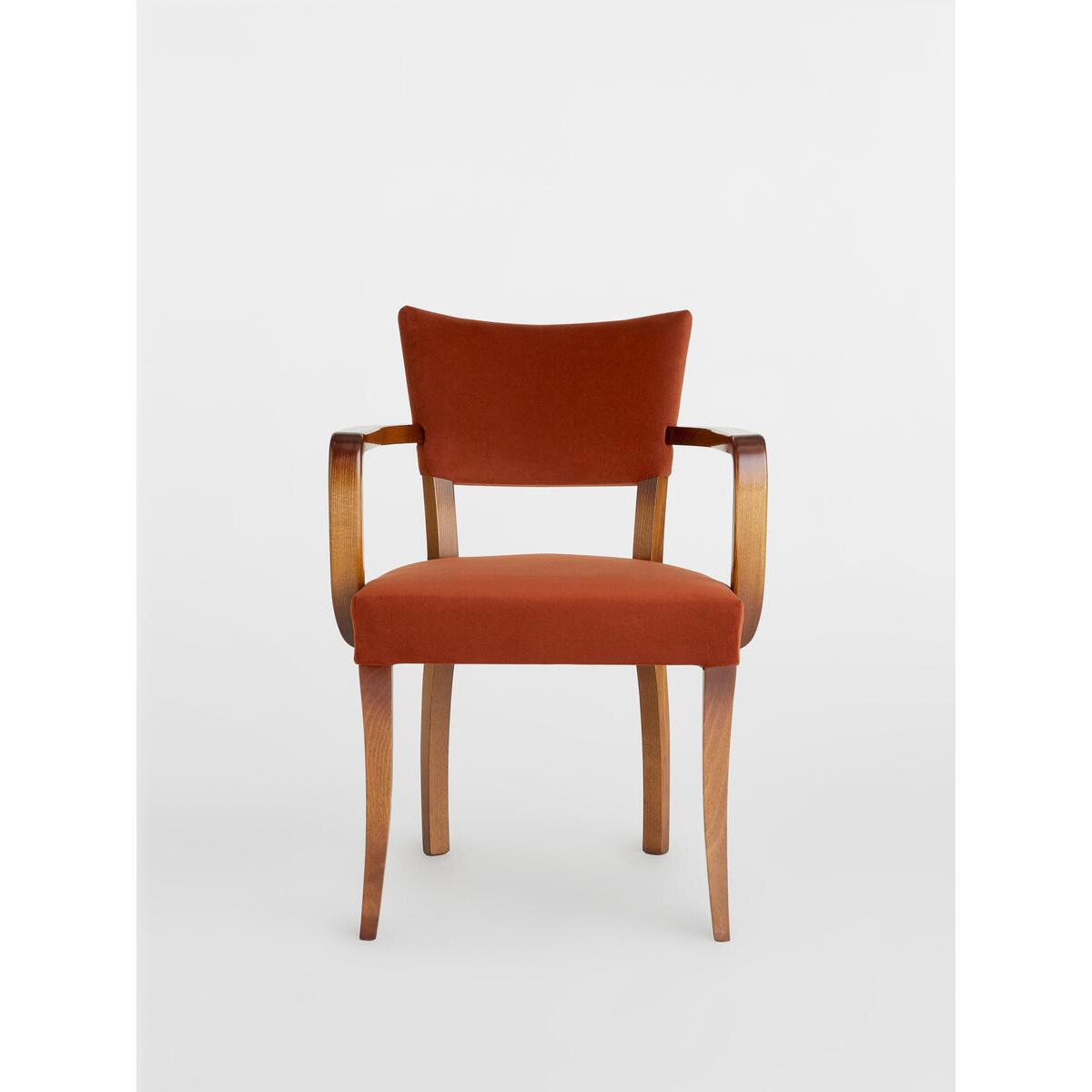 A House hero, you'll find our comfy upholstered dining chaireverywhere from High Road House to Soho House Berlin, as well as avintage version in Kettner's Townhouse. The chair is made in Italywith a hardwood beech frame and is upholstered in cottonvelvet. Dining chair with upholstered seat and back. Curved wooden arms. Upholstered in cotton velvet. Dark hardwood beech frame. Inspired by the vintage dining chairs at Kettner's Townhouse.