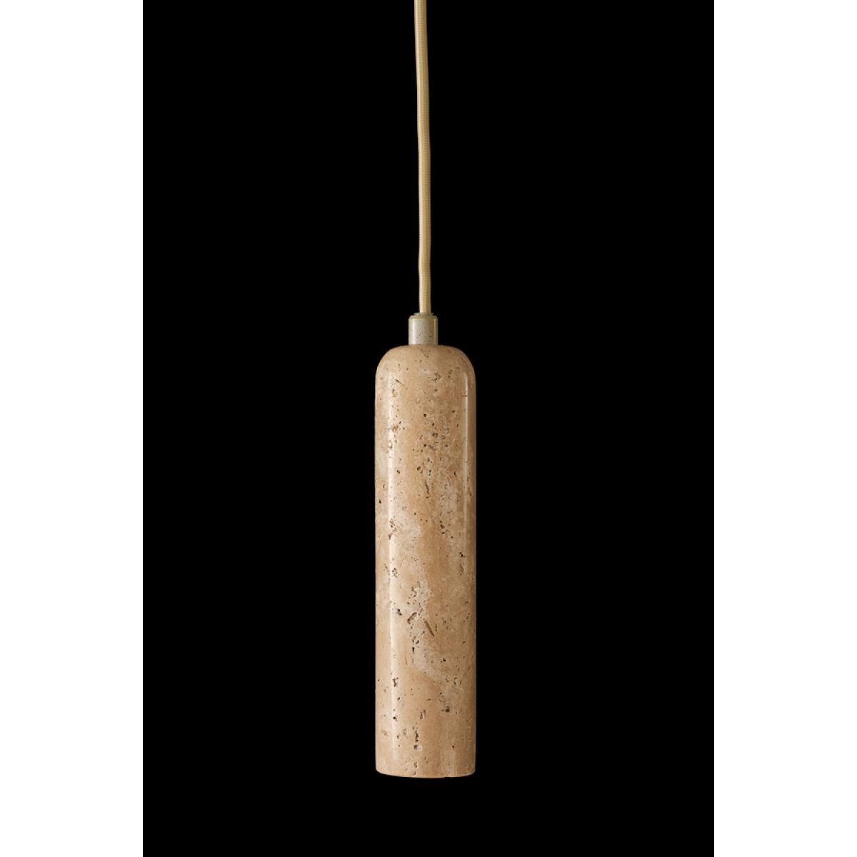 A striking, sleek pendant light designed for use above breakfast bars, counters and bedside tables. Hang in multiples for maximum impact, either in a straight line or in a cluster at varying heights - creating a chandelier effect. Hand-crafted from solid travertine. Woven fabric cable. Powder coated steel ceiling rose. Height adjustable prior to installation. Supplied with MR11 LED bulb (non-dimmable).