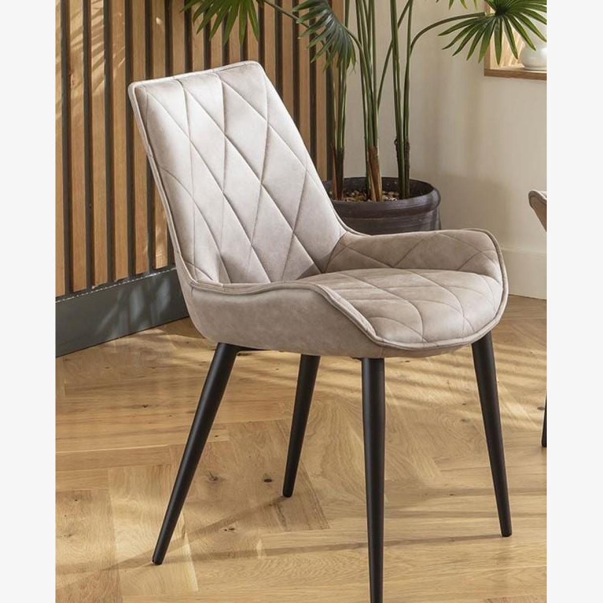 These modern dining chairs feature a contemporary shape, premium build quality, and elegant light grey fabric upholstery. With raised sides for added stability, stitching detail, and sturdy metal legs, this luxury grey dining chair is the perfect addition to any dining room or kitchen. Our modern dining chairs boast a sophisticated design with a contemporary shape that complements any decor. The seat's raised sides and low profile offer extra stability and comfort, making these dining room chairs not only stylish but also highly functional. The rhombus stitching details add a touch of elegance and craftsmanship to each chair. Crafted from light grey premium fabric, our fabric dining chairs offer both luxury and durability. The upholstery is soft to the touch, providing a comfortable seating experience while maintaining a sleek and modern appearance. The high-quality fabric ensures that these kitchen chairs remain a staple in your home for years to come. The metal legs of our luxury dining chairs are finished with a black powder coating, ensuring a sleek and modern look. These sturdy legs provide excellent support and stability, making them ideal for everyday use. The combination of metal and fabric creates a perfect balance of style and functionality in your dining space. W85cm D58cm H62cm Seat Height 50cm Modern Grey Fabric Dining Chair