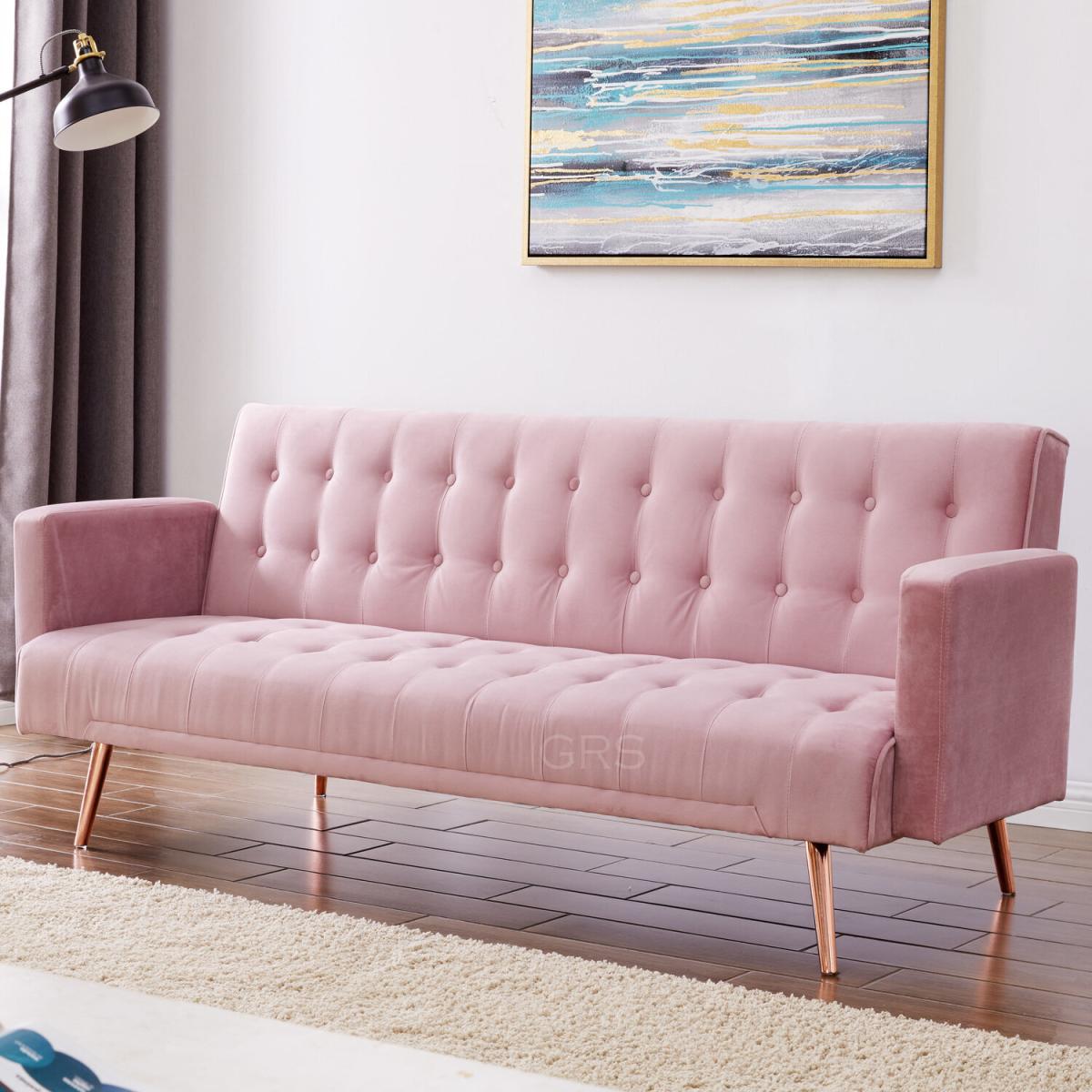 Introducing MOLLY a 3 seater sofa bed available in 4 stunning colours, The grey and pink velvet sofa bed comes with a contrasting rose gold metal leg and the blue and green velvet come with an elegant gold metal leg. Molly has a tufted seat and backrest with fixed armrests giving it an elegant design. Convertible design - this sofa bed has a simple clic-clac mechanism that allows it to swiftly and simply transform from a sofa to a recliner to a bed, making it ideal for overnight guests. This sofa bed cannot be freely positioned in your room. The back of this sofa bed is upholstered in a black woven fabric that does not match the colour of the sofa bed fabric. Velvet is an excellent choice for sofa bed upholstery, its richness of colour and soft texture makes it undeniably stylish. Depending on the lighting, velvet can have a distinct appearance, in natural light it tends to shimmer more, whereas in artificial lighting indoors, it tends to look more subdued. If you stroke velvet with your hand in different directions, the colour may fluctuate, to balance things out, stroke in one direction with an open palm. To get the most out of your sofa bed we recommend gently cleaning with the upholstery attachment of your vacuum cleaner or using a sofa hand brush once per week. You might need to screw the legs to the underside as some of our sofa beds since they don't all have pre-drilled holes. All of our sofa beds come with an easy-to-follow assembly guide. Delivered by our friendly couriers on a 2-man delivery service within 3-7 working days. The courier will deliver to a room of your choice.
