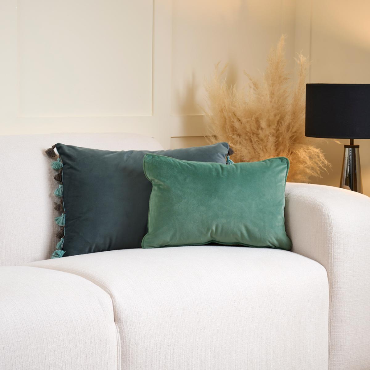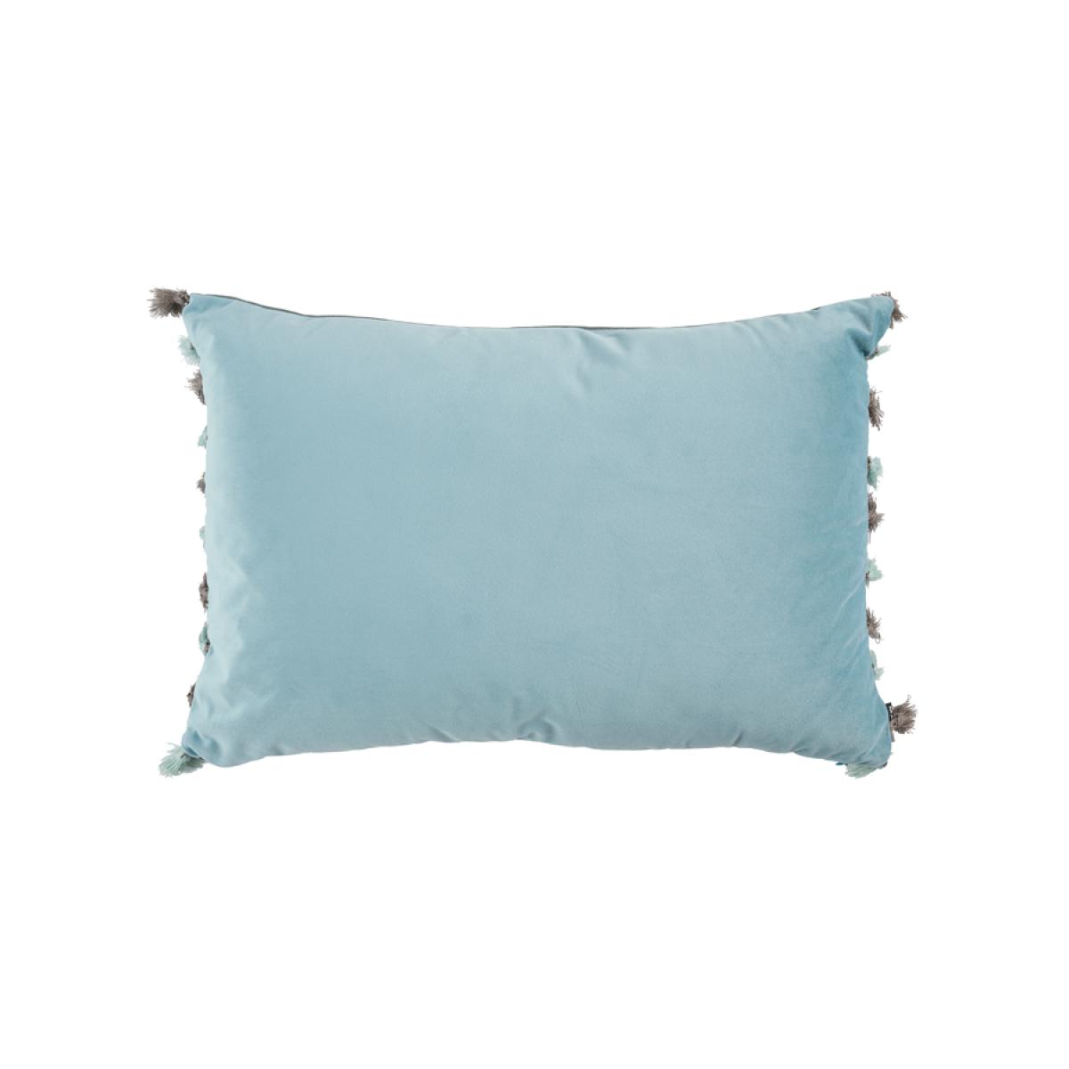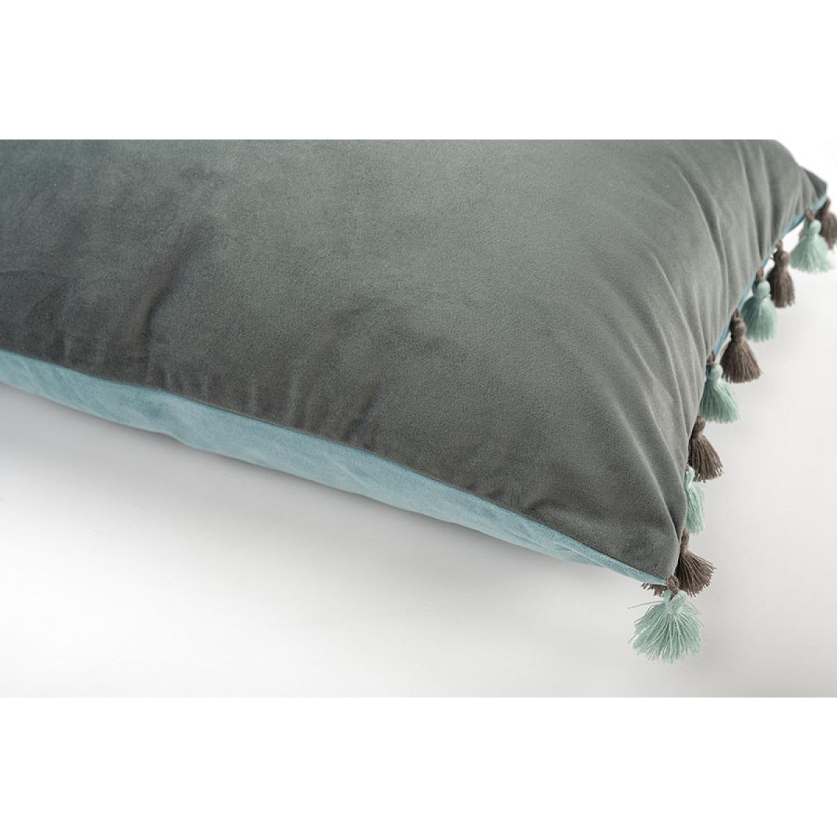 A reversible eucalyptus and aquamarine coloured cushion with coordinating tassel edges. 45cm x 60cm. Matte velvet polyester fabric. Supplied complete with hollowfibre pad. Zip fixing. Dry clean only, do not bleach or tumble dry.