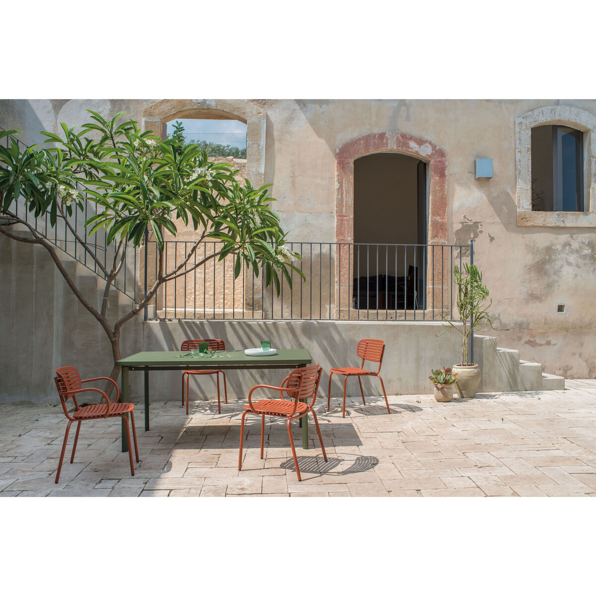 Jolly, colourful and graphical, the Mom collection was created by the French designer, Florent Coirier. These steel slat seats with gentle curves are inspired by traditional Japanese "Suiban" trays. Playing with the solid and empty structures, the slats create delicate and graphical striped patterns. The curved, oval-shaped, wide backrest is welcoming. The Mom chairs are perfect to create a pleasant dining area on a terrace or in a kitchen. As pretty as it is practical, the Mom collection is designed for practical use: all the seats are stackable and resistant to bad weather.