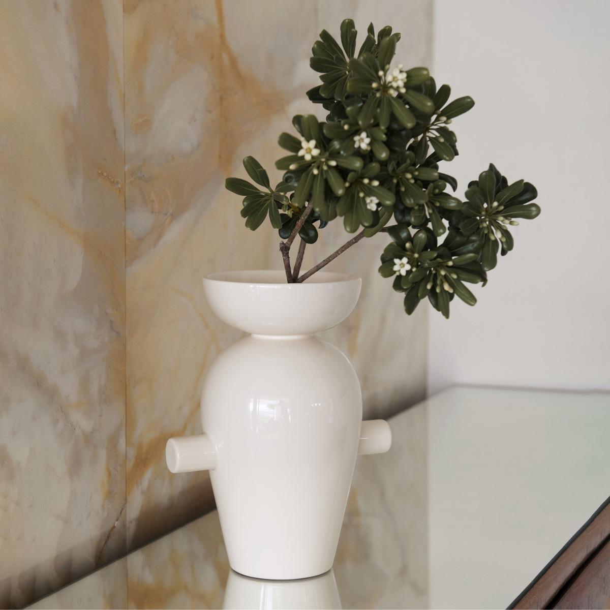 This Christening of the Momento JH40 is a beautiful example of sculptural design, combining functionality with a sleek, modern aesthetic. Its clean white ceramic finish makes it versatile, working particularly well in minimalist or contemporary interiors, but it also has the flexibility to add an architectural touch to eclectic schemes. I love how it doubles as both a statement piece and a functional vase, perfect for showcasing a simple bouquet of fresh or dried flowers. Styling tips include placing it on a neutral sideboard or integrated into a display with textured ceramics for visual interest. For a striking look, pair it with contrasting materials like wood or brass to highlight its sculptural form.