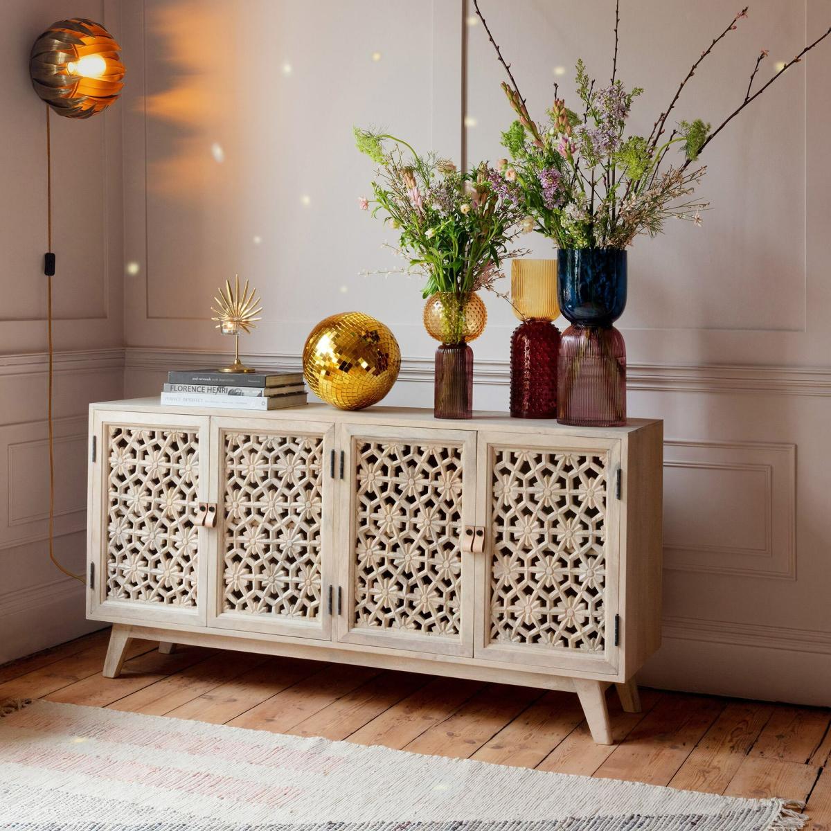 I really like this sideboard for its intricate carved detail, which adds a subtle layer of texture and visual interest without dominating the space. It works well in both contemporary and eclectic interiors, especially when paired with modern accessories or vintage pieces to create a personalised look. Practical styling tips include keeping the top surface uncluttered-perhaps with a few curated decorative objects like vases or candles-so it stays functional. Its light tone makes it versatile, and it’s ideal for use in living rooms, dining areas, or even a hallway, offering ample storage while maintaining a light and airy feel.