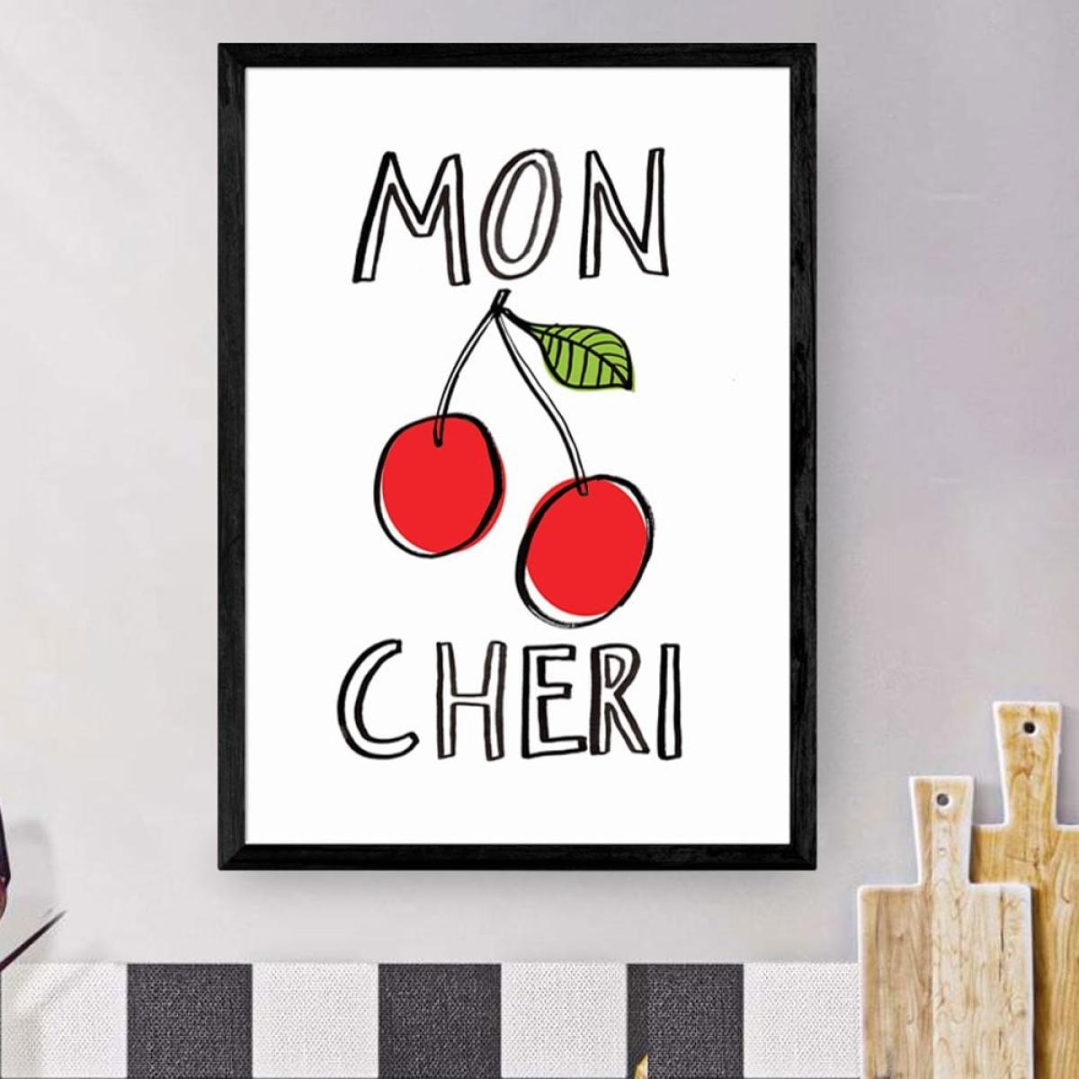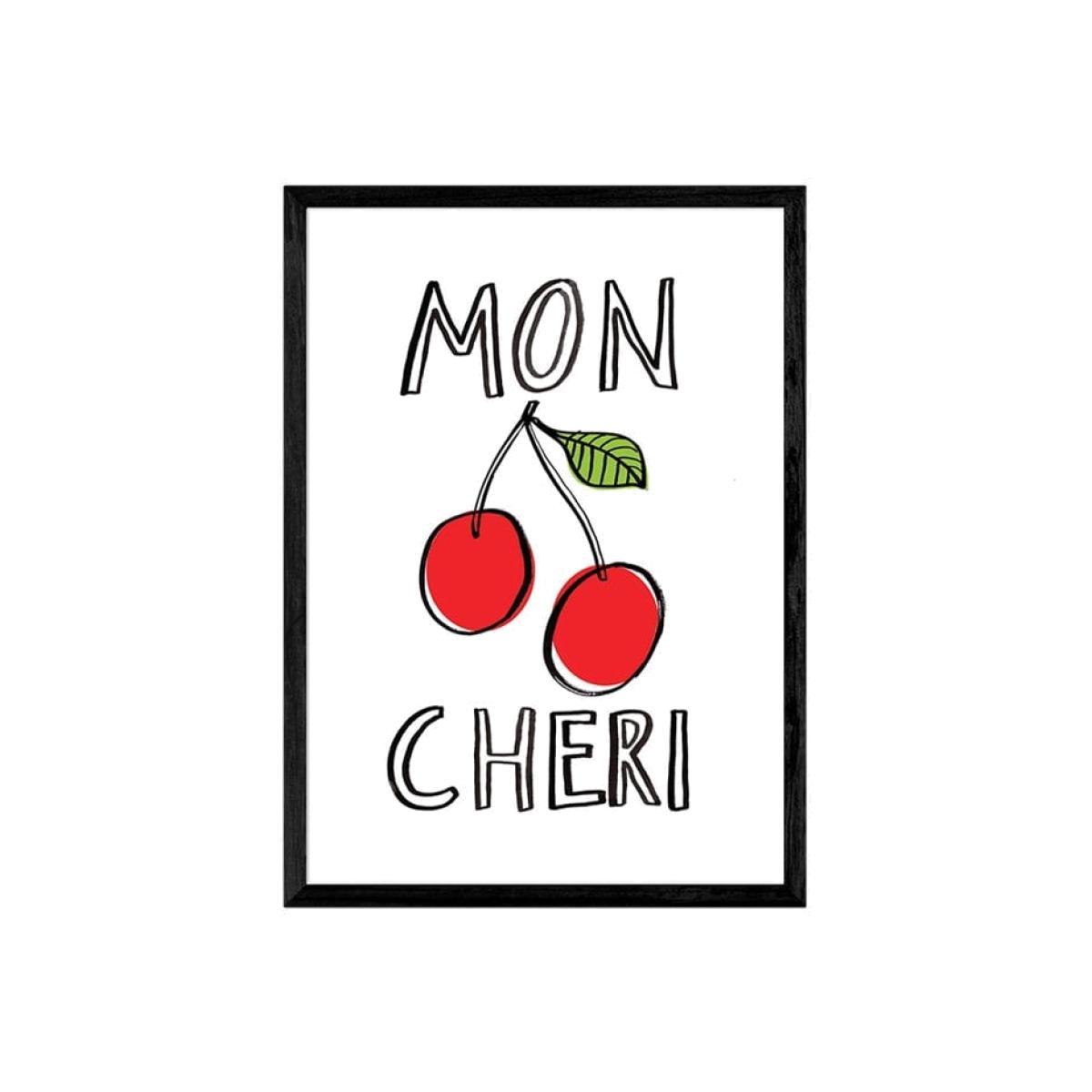 Meaning "My Dear" this popular French phrase is the ideal gift for your loved one, or if you just want to treat yourself. This red cherry print is the perfect way to inject fun, colour, and style into your bedroom. Only giclée printing processes are used for this print resulting in the highest quality museum-level colours and sharpness. Choose between a number of different coloured frames and two sizes for the perfect print for your space.