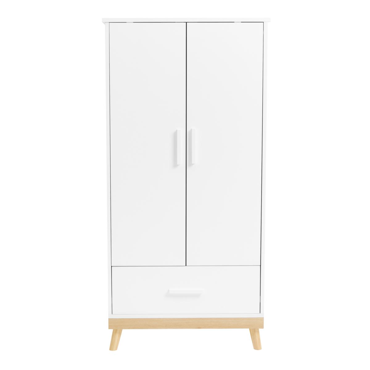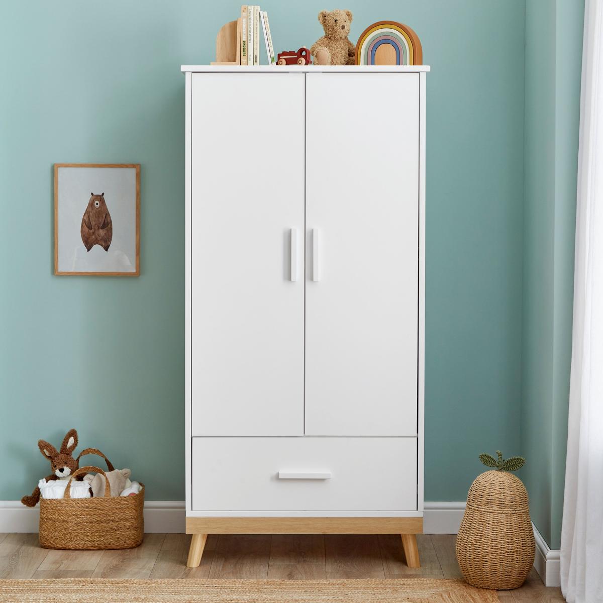 * Minimalist design * Wooden frame * Hanging space and drawer This wardrobe is designed to maximise storage with a practical layout that includes a drawer and two hanging rails. The minimalist design allows the wardrobe to seamlessly integrate into your nursery, adding both storage capacity and style. The drawer provides extra space for smaller items, while the hanging rails are ideal for baby clothes.
