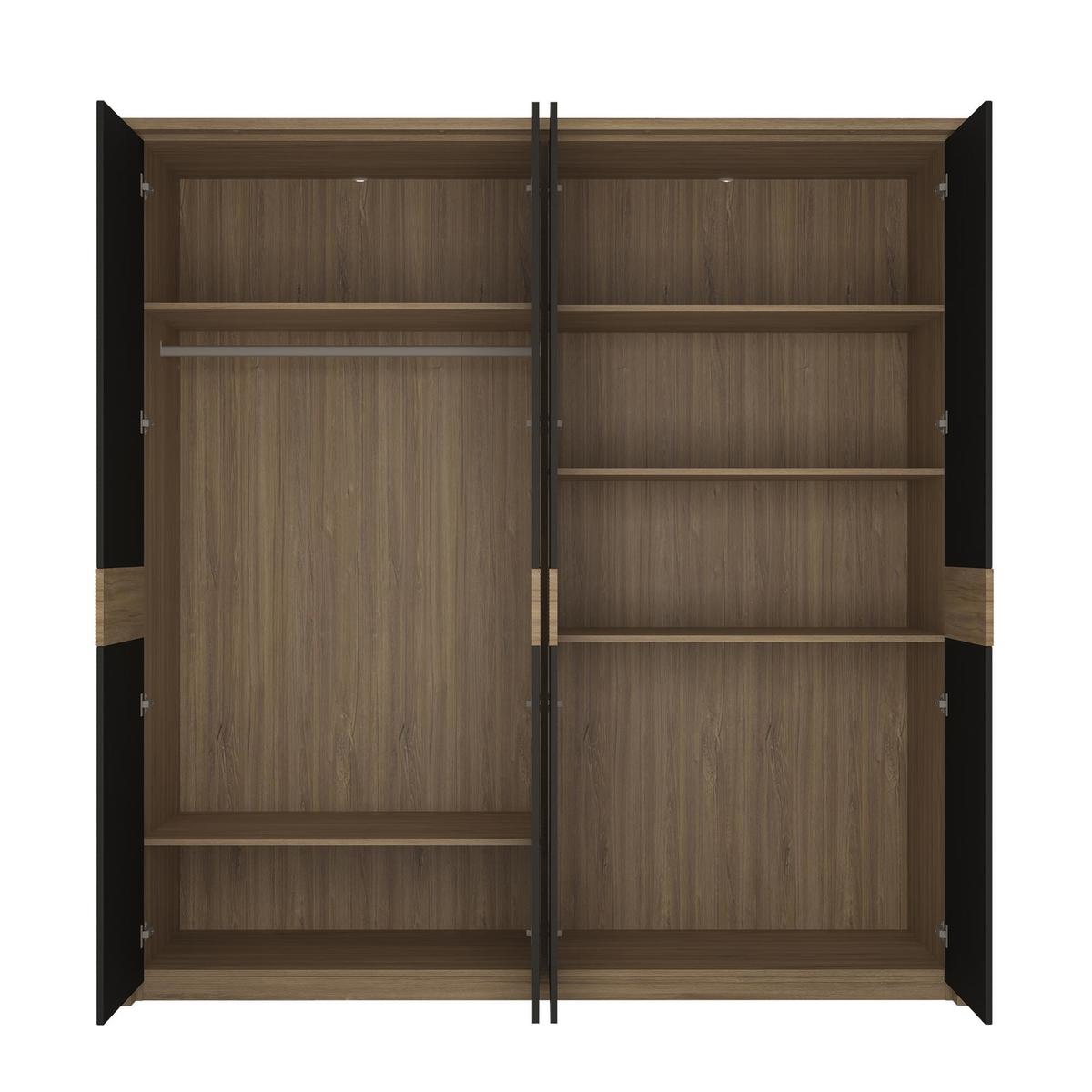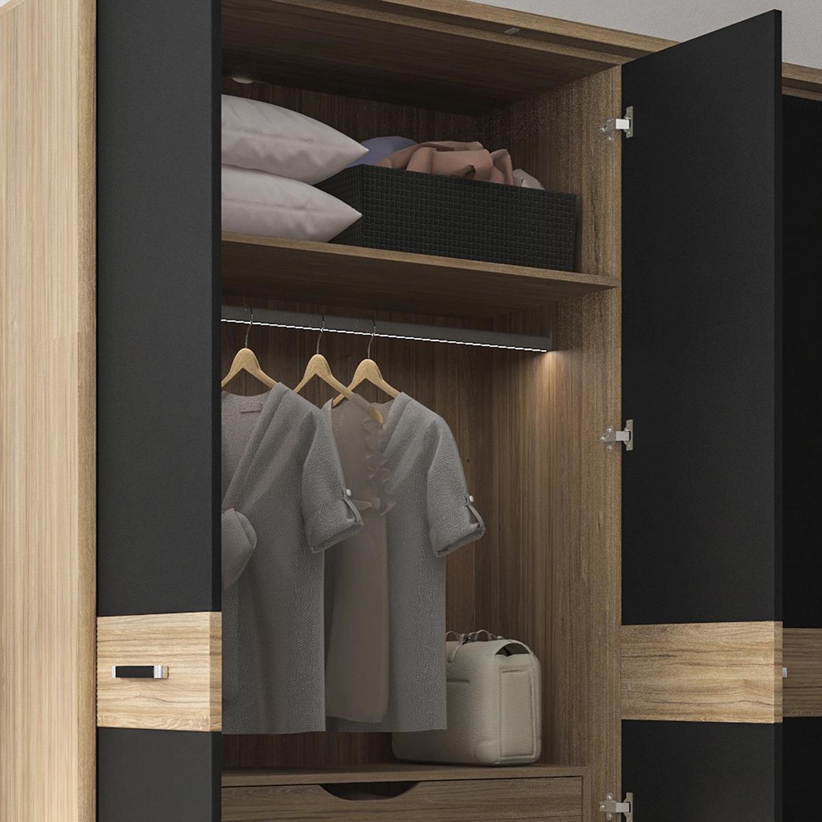 I love the Monaco four-door wardrobe’s sleek black finish combined with the wood accents, making it a versatile piece that suits modern and contemporary interiors alike. Its clean lines and mirrored doors not only create a sense of space but also add a touch of sophistication. Ideal for bedrooms with minimalist or Scandinavian themes, it works well to introduce dark tones without overwhelming the space. For styling tips, consider pairing it with neutral-coloured bedding or soft textures to soften the look. Additionally, the integrated lighting adds a practical glow, perfect for highlighting your wardrobe contents and making it a feature in the room.
