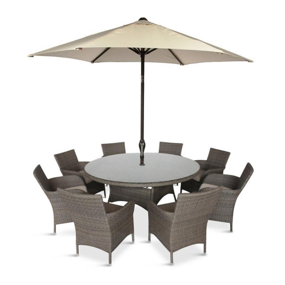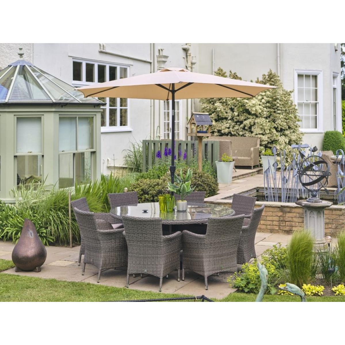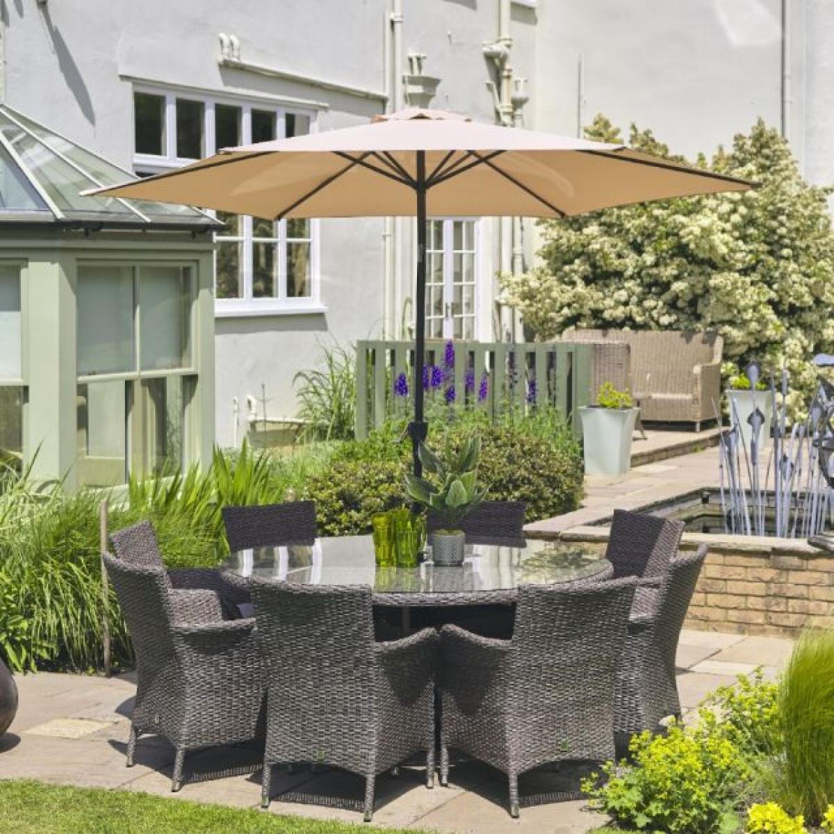 Ideal for large families or outdoor entertaining, the Monaco 8 Seater Round Garden Dining Set in Stone with cream parasol is perfect for your garden. Constructed from a weatherproof aluminium frame and a half moon weave, the cushions are showerproof The cushions are also water repellent and UV resistant, meaning they will keep their natural colour for longer.