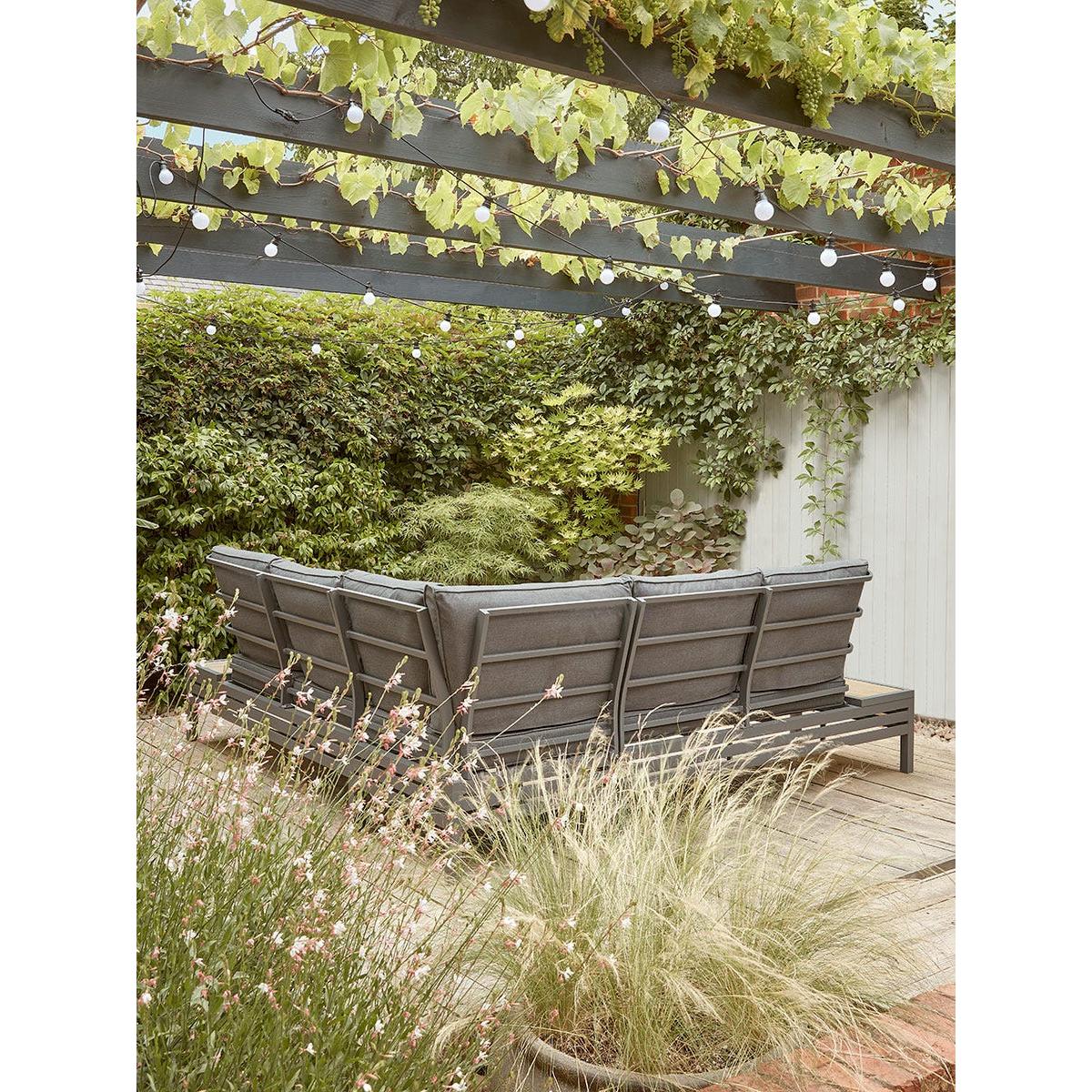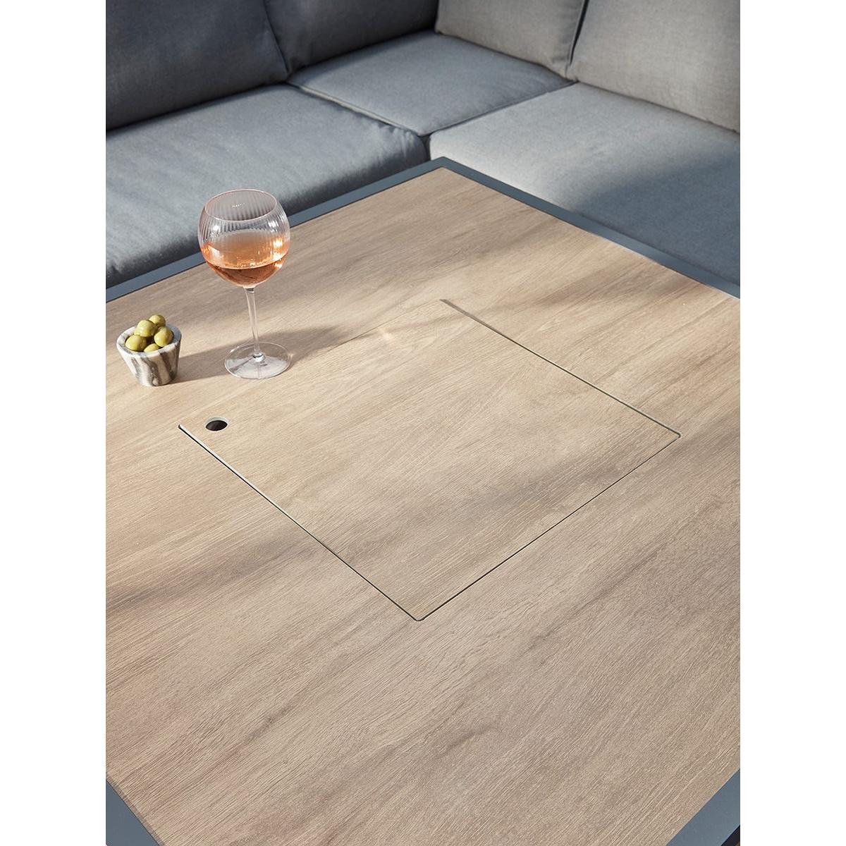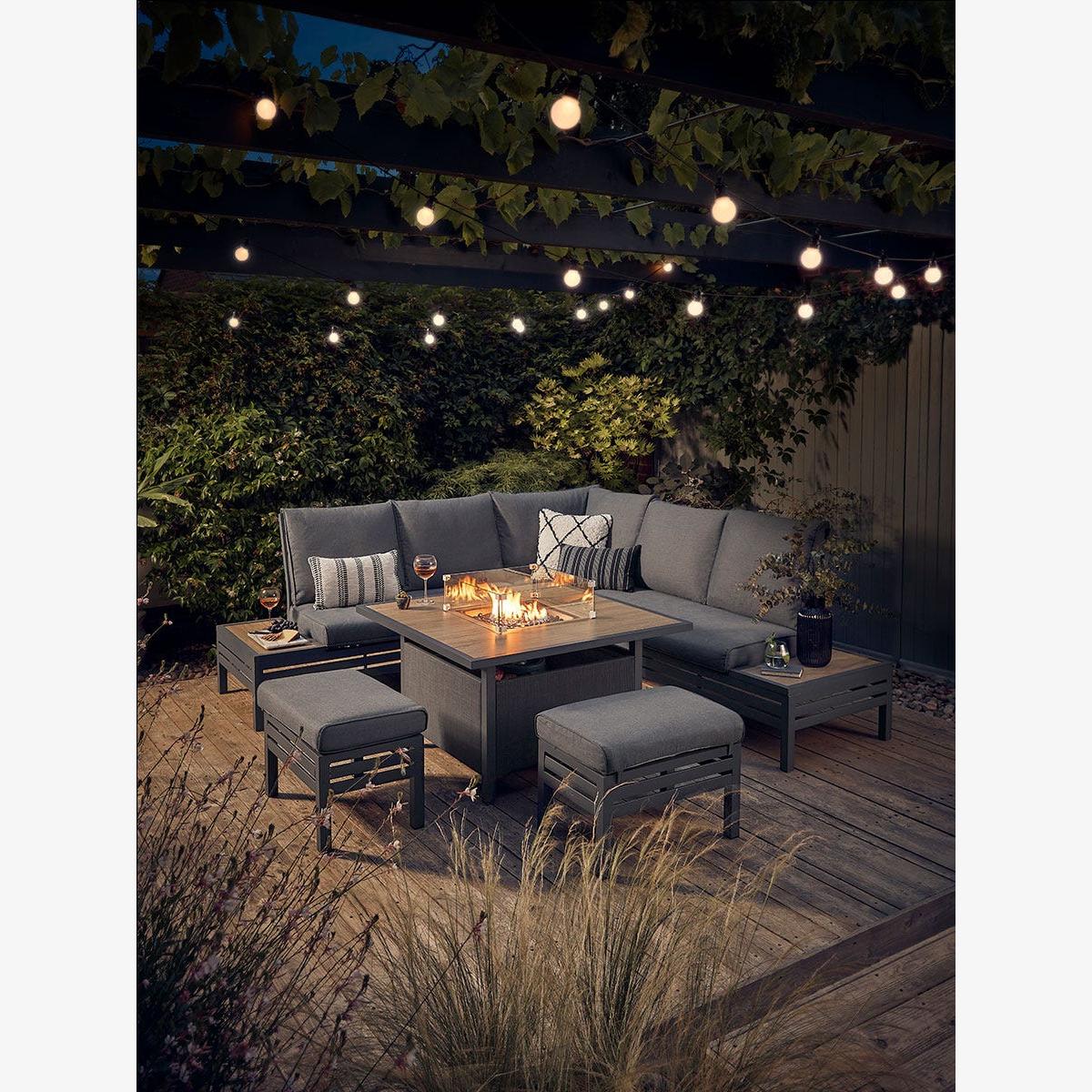 Perfect for parties, long lazy lunches and summer drinks that go on well past dusk, our Monaco Corner Dining Set features an integral firepit to provide any outdoor occasion with atmosphere and warmth. This impressively proportioned set includes two sofas, with handy side table ends that make up the corner seat and two benches. The square dining table has a central firepit which can also be covered over and used as a plain surface. Made from double powder coated aluminium which offers hardwearing sleekness, the set has realistic wood-effect aluminum slatted table tops and comfortable cushions.