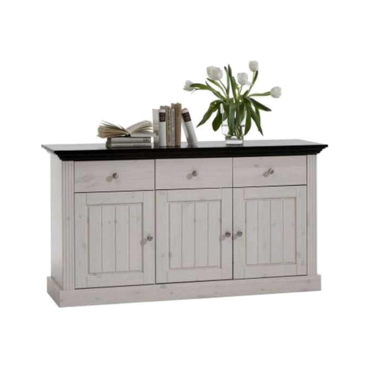 This sideboard is a versatile piece that works beautifully in both contemporary and rustic interiors thanks to its clean lines and classic wooden detailing. I love its neutral white tone with contrasting black top, which makes it easy to style with a variety of colour palettes and decorative accents. It's perfect for storage in dining rooms, living areas, or even hallways, providing practical space without sacrificing style. For styling tips, consider pairing it with simple ceramic vases or fresh flowers for a fresh look, and keep the top clutter-free to highlight its natural textures. Its three drawers and ample cupboard space make it both functional and stylish, ideal for creating an organised yet inviting atmosphere.