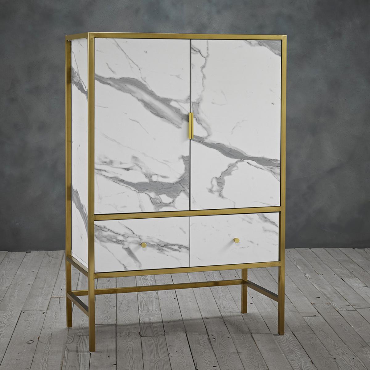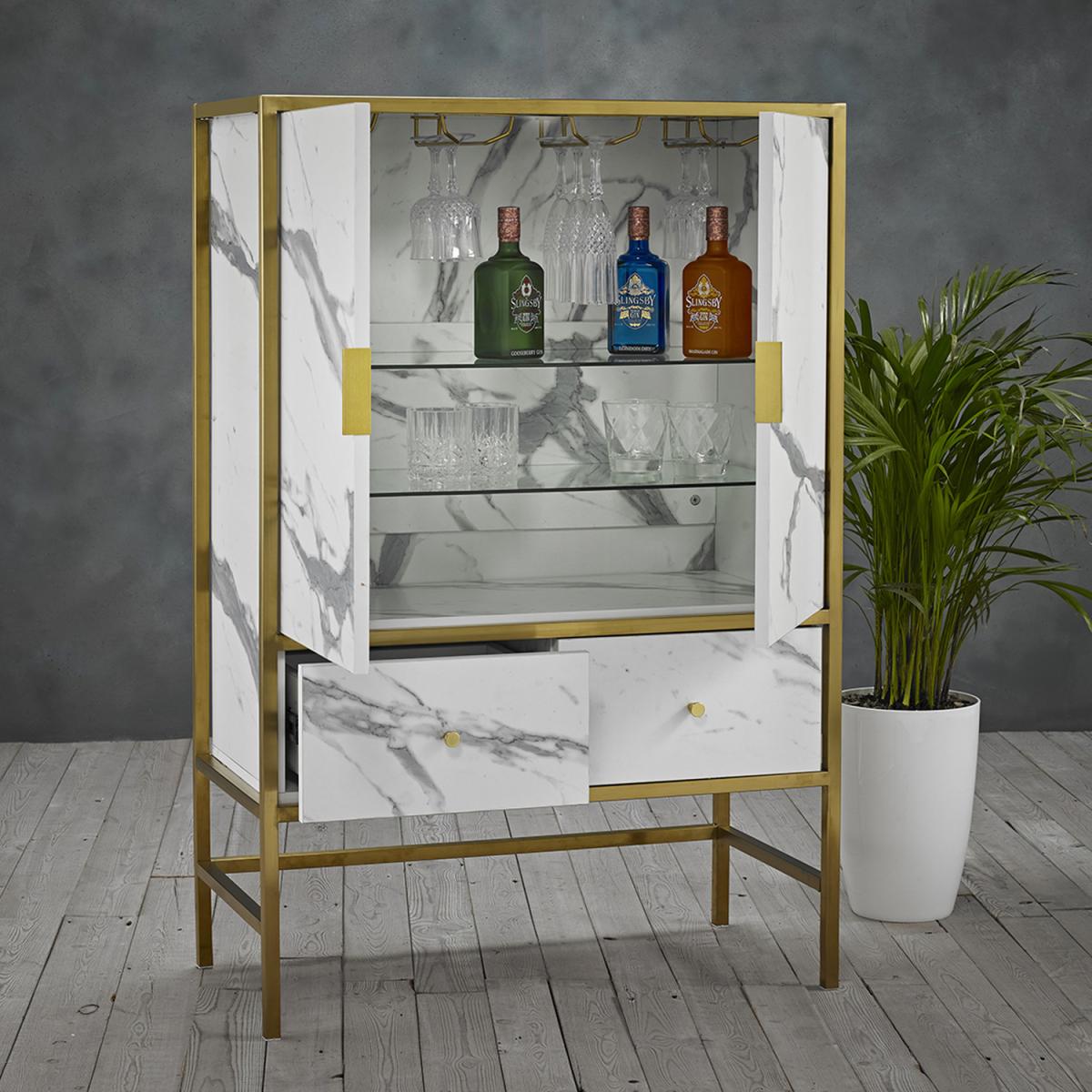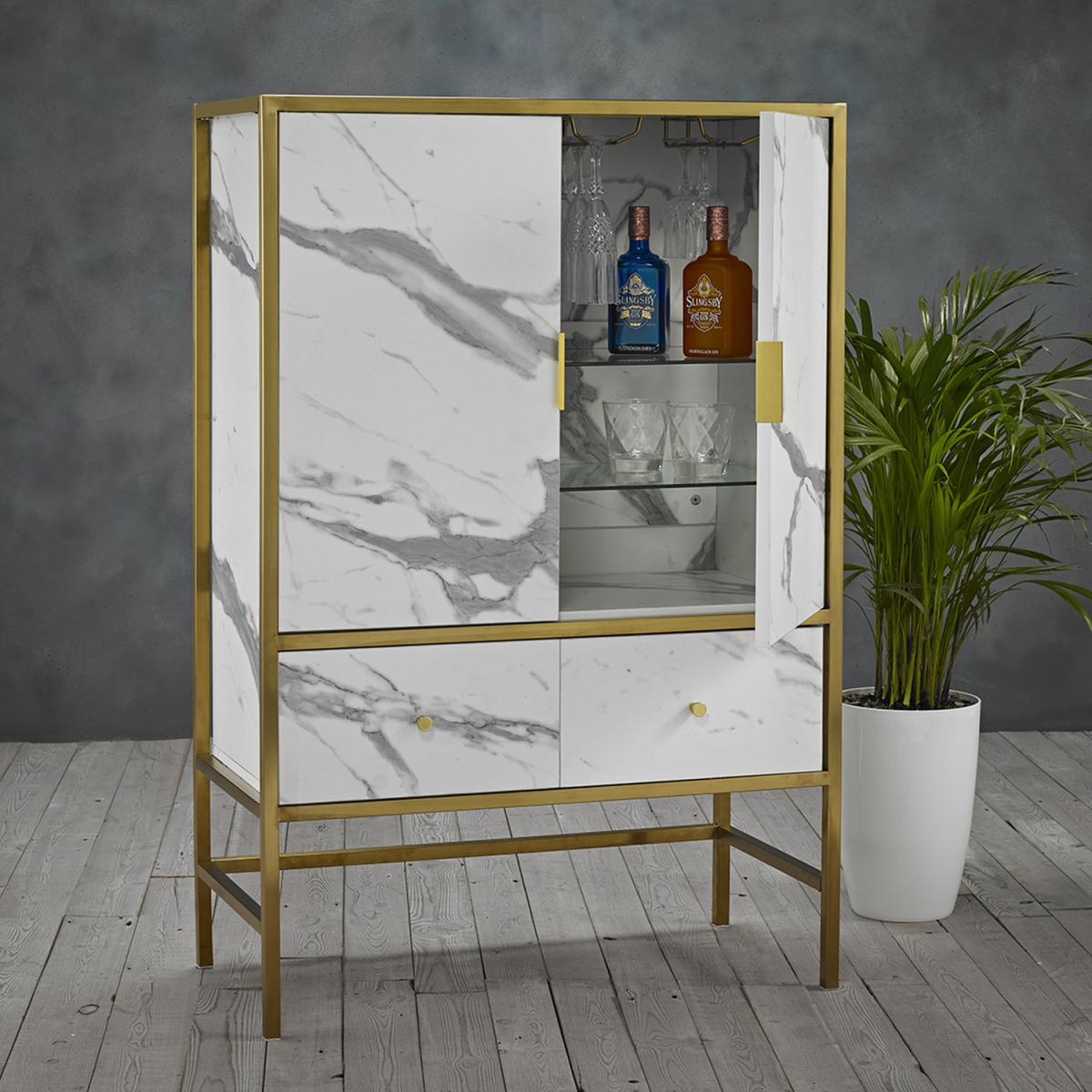 The Monaco wine cocktail cabinet will be the new piece de resistance to your living space! Add that wow factor when entertaining guests, or just yourselves, with this luxurious cabinet that will house all your entertaining needs. Removable shelves to accommodate your storage requirements. Available in white or black faux marble with a sleek gold frame, this piece is an easy, glamorous, yet affordable update for your home.