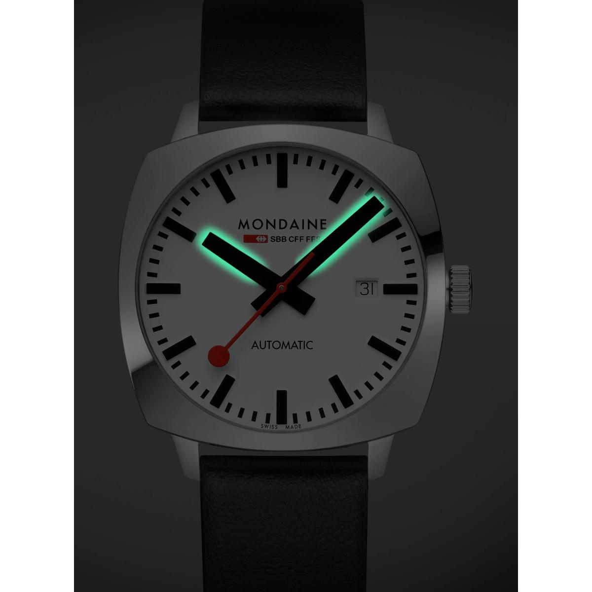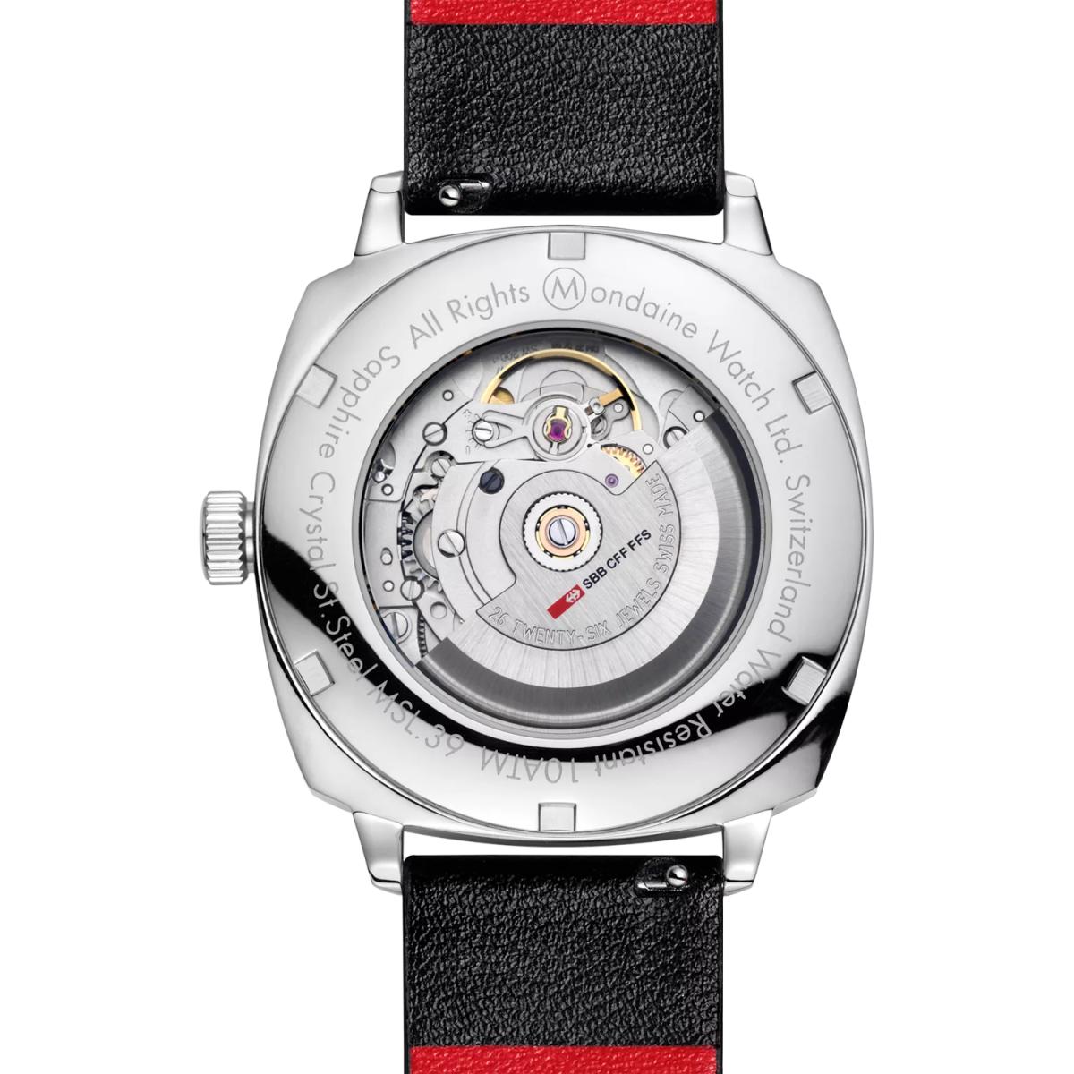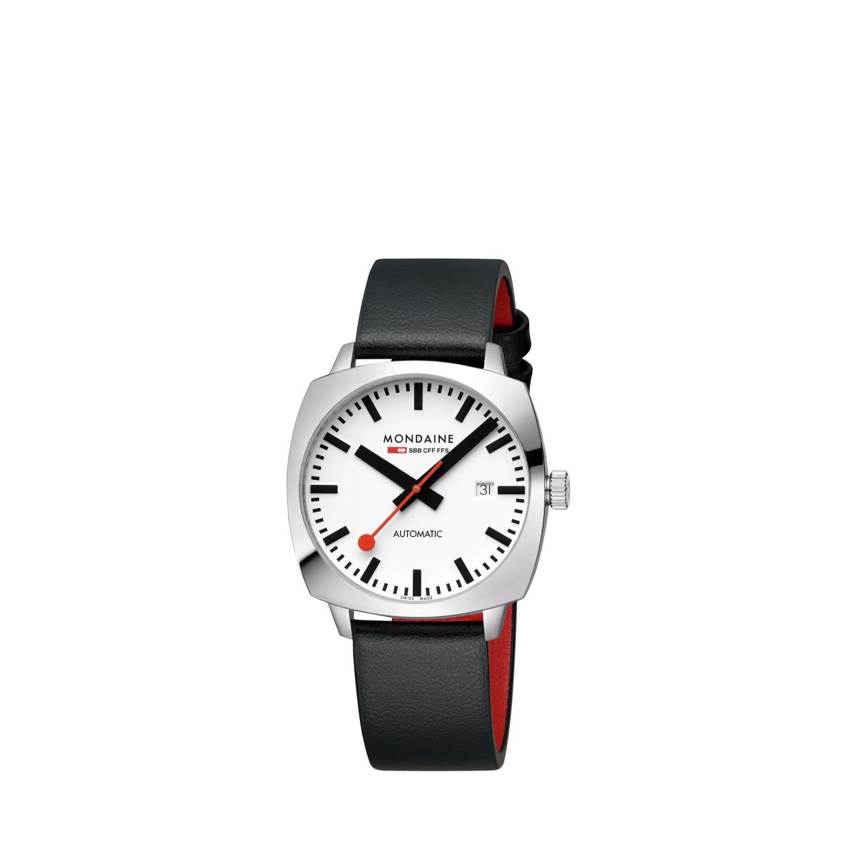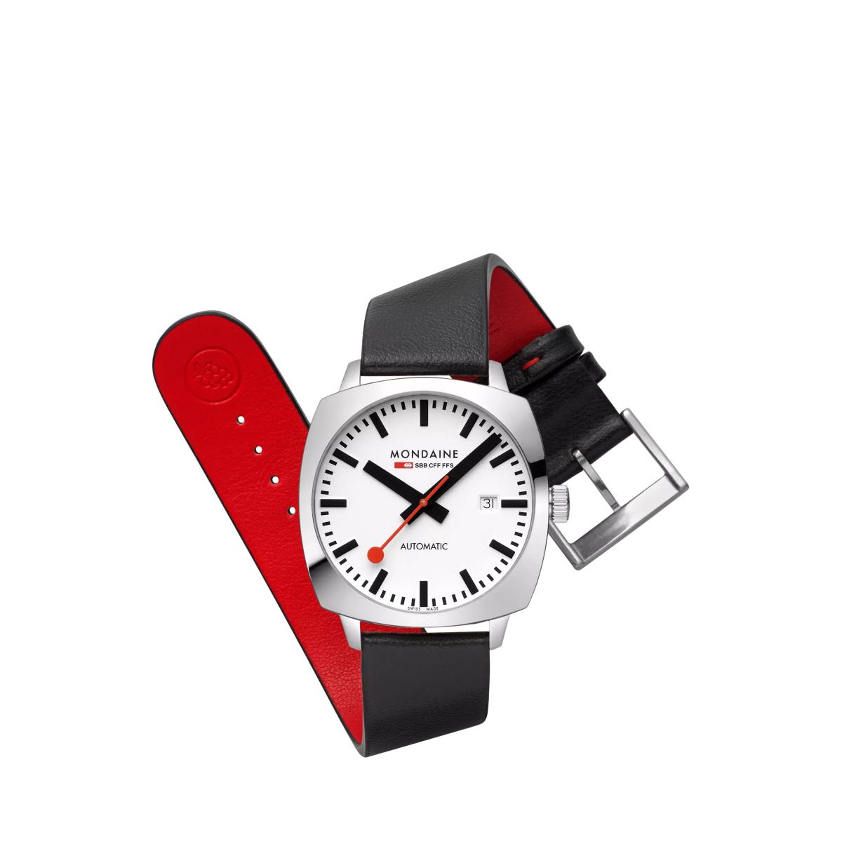The Cushion Automatic is inspired by a vintage design with a timeless case that pays homage to Mondaine's heritage. The 39mm cushion-shaped stainless steel case is paired with a white dial and signature red second hand. Powered by a Swiss automatic movement with a 38-hour power reserve, this watch operates without a battery, reducing electronic waste. The anti-reflective sapphire crystal enhances durability, while the patented Back. Light technology ensures readability in the dark. Featuring a see-through case back and a vegan grape leather strap, the Cushion Automatic is a perfect fusion of heritage and craftsmanship.