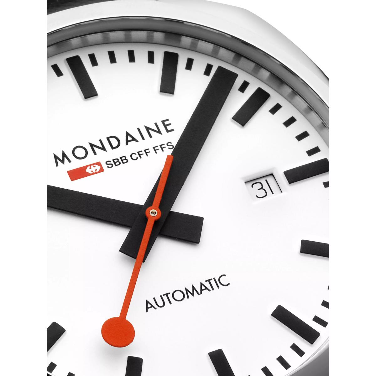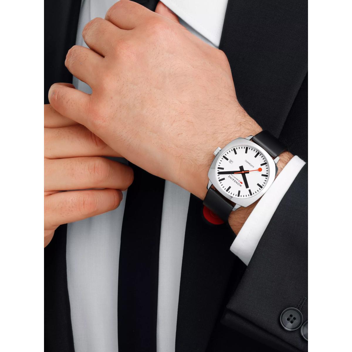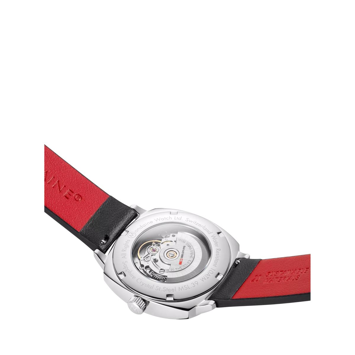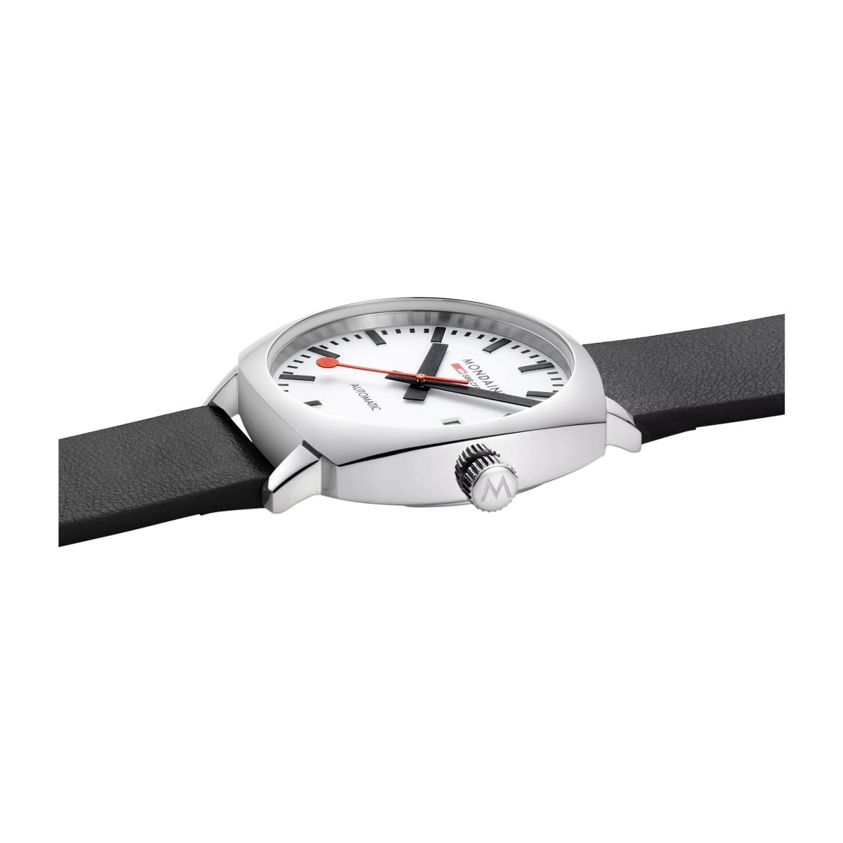 The Cushion Automatic is inspired by a vintage design with a timeless case that pays homage to Mondaine's heritage. The 39mm cushion-shaped stainless steel case is paired with a white dial and signature red second hand. Powered by a Swiss automatic movement with a 38-hour power reserve, this watch operates without a battery, reducing electronic waste. The anti-reflective sapphire crystal enhances durability, while the patented Back. Light technology ensures readability in the dark. Featuring a see-through case back and a vegan grape leather strap, the Cushion Automatic is a perfect fusion of heritage and craftsmanship.
