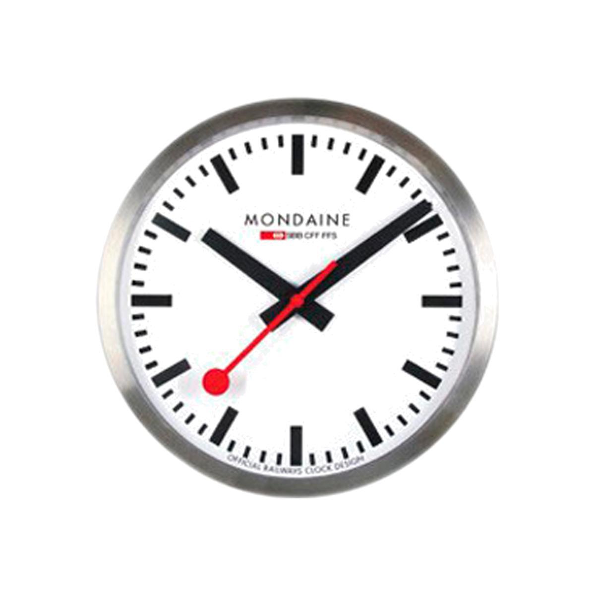 Inspired by the Official Swiss Railways Station Clock that Hans Hilfiker designed in 1944, the Mondaine Wall Clock would lend a touch of industrial charm to any space. A strikingly contemporary design, this simple clock features the same bold black minute markers and red second hand of the original clocks. Enclosed in a brushed aluminium case and fitted with reliable quartz movement, the dust-resistant clock is finished with a hardened mineral front. A simple yet distinctive design, the Mondaine Wall Clock would enhance any wall with its refined aesthetic. Requires: 1x AA battery (not included).