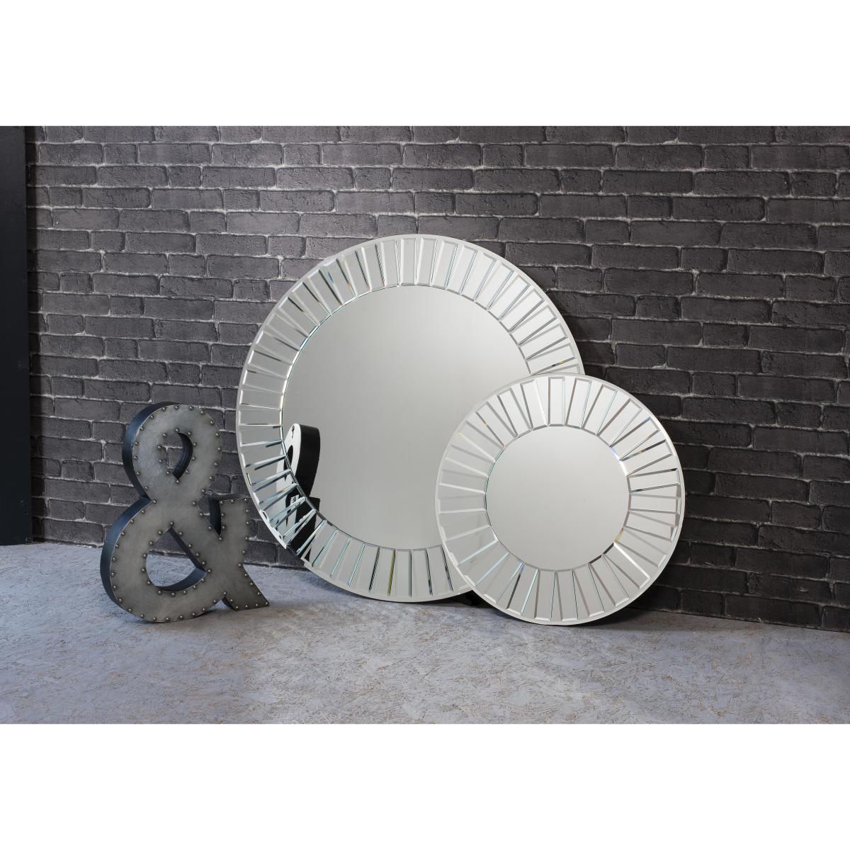 The Mondello Mirror is sure to shine in your home. Around the central mirror is a deep frame set with bevelled glass, creating an outwardly radiating mosaic effect, like a stylised sun. This lovely large, round mirror’s timeless deco style suits both modern and classic interiors. Measuring three feet in diameter, it makes a bold and stylish statement on any wall. Striking large round decorative mirror. Deep frame set with bevelled glass pieces. Mirrored glass radiates outwards creating a mosaic effect. Deco style suits both modern and classic interiors. Makes a bold style statement, measuring three feet across. Dimensions. Height: 90cm (35 inches). Width: 2.2cm (1inch). Depth: 90cm(35 inches).