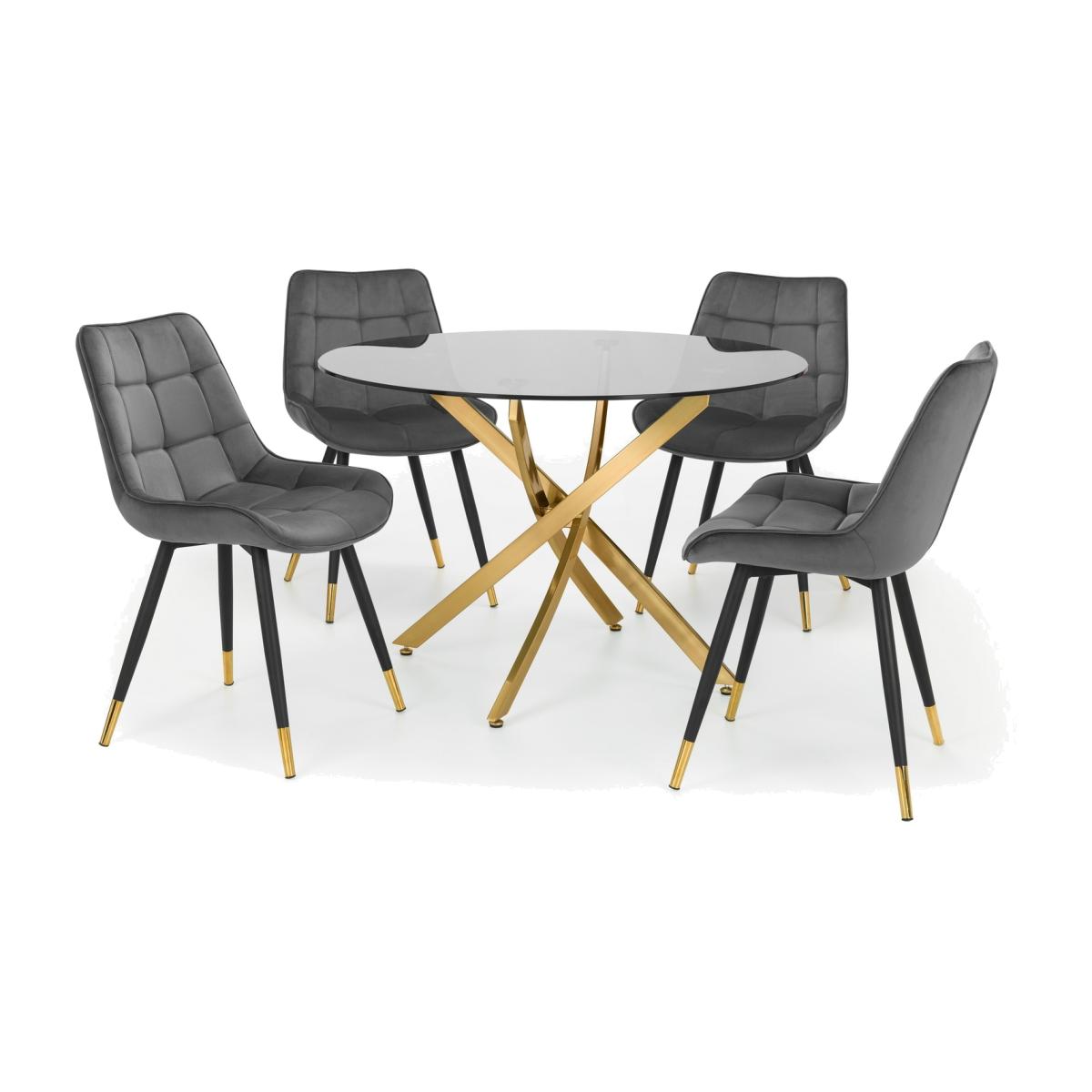The Monero round table paired with the Hadid chairs set makes for a sleek, contemporary dining solution. I love its versatile grey tones, which work beautifully in both minimalist and industrial interiors, offering a chic neutral that can be easily styled up or down. The round table promotes intimate conversation, while the gold accents on the chairs’ legs add a touch of luxe. For practical styling, I’d recommend pairing this set with soft textiles and layered tableware for casual weekends, or with bold accessories and statement lighting for a more polished look. It’s especially well-suited for smaller dining areas or open-plan spaces where a modern, streamlined aesthetic is desired.
