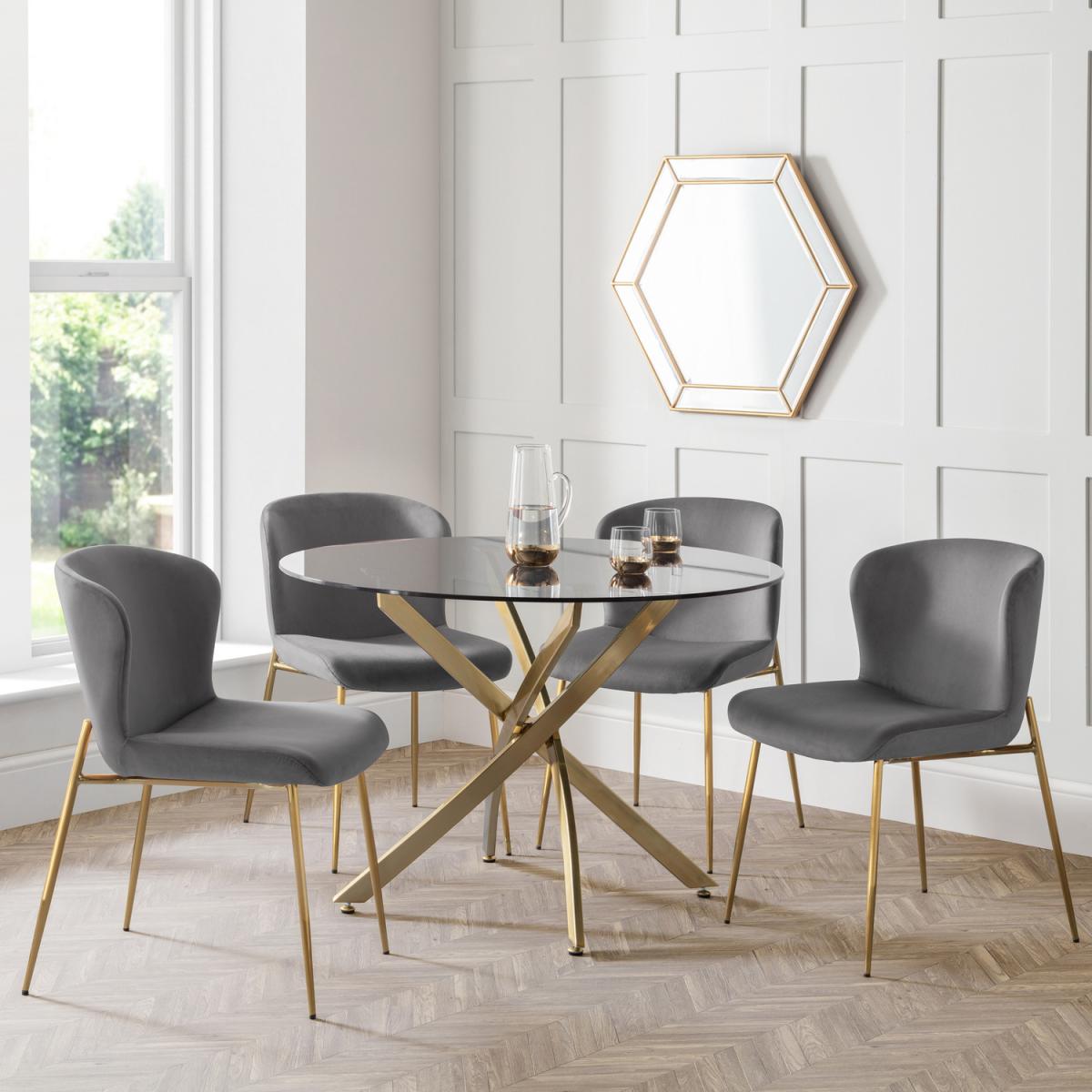 I love this round table and chair set for its clean, modern aesthetic that easily elevates a variety of interiors, from contemporary to eclectic. The grey upholstery on the Harper chairs adds a versatile, neutral tone that complements both bold colours and softer palettes. The gold accents on the legs bring a touch of sophistication without feeling overly formal. For styling, it's best suited to open-plan dining areas or kitchens, where its sleek design can be a focal point. To keep it looking fresh, pair with minimal accessories like a simple centrepiece or a textured runner. Also, since the table is round, it encourages easy conversation and creates a welcoming atmosphere, making it perfect for casual family dinners or small gatherings.