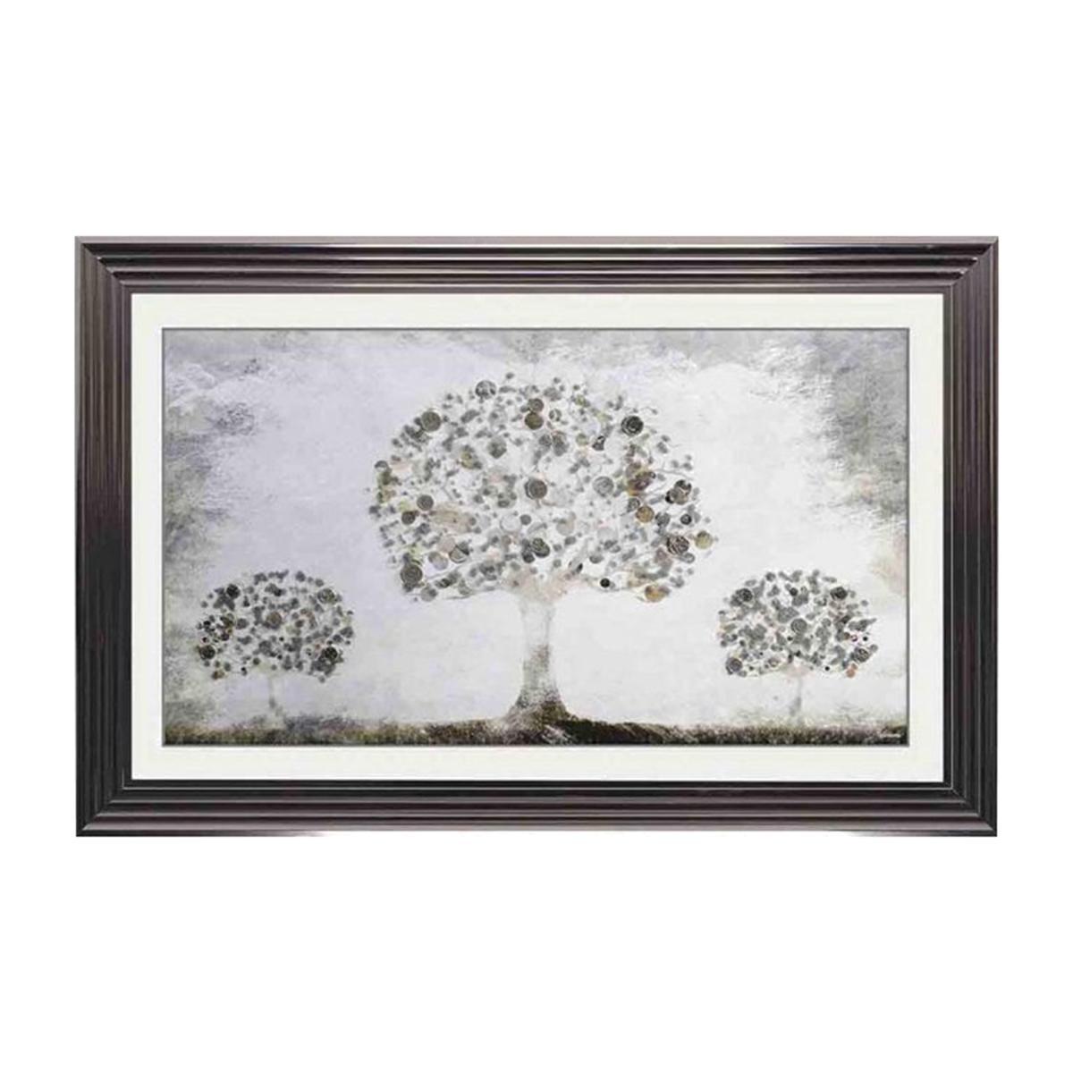 Decorative framed print depicting a money tree. Embellished with hand-applied liquid art and real silver coloured pennies. In a high quality metallic frame. Our Silver Money Tree framed art looks exquisite in its metallic frame. This beautiful piece of wall art under glass features a silver money tree adorned with real silver pennies and hand-applied, glistening liquid art. This piece of wall art is decorative and mesmerising – and, who knows, it might even bring you luck!. Made in the UK, this framed and embellished print looks beautiful, especially when displayed with our other equally decorative tree prints, the Cherry Tree framed picture and the Blossom Tree framed art. Some pieces of wall art can be fairly weighty, so make sure the wall you hang it on can support it. Dimensions:. Width: 115cm (45 in). Height: 75cm (30 in). Depth: 4cm (2 in). Weight: 8kg.