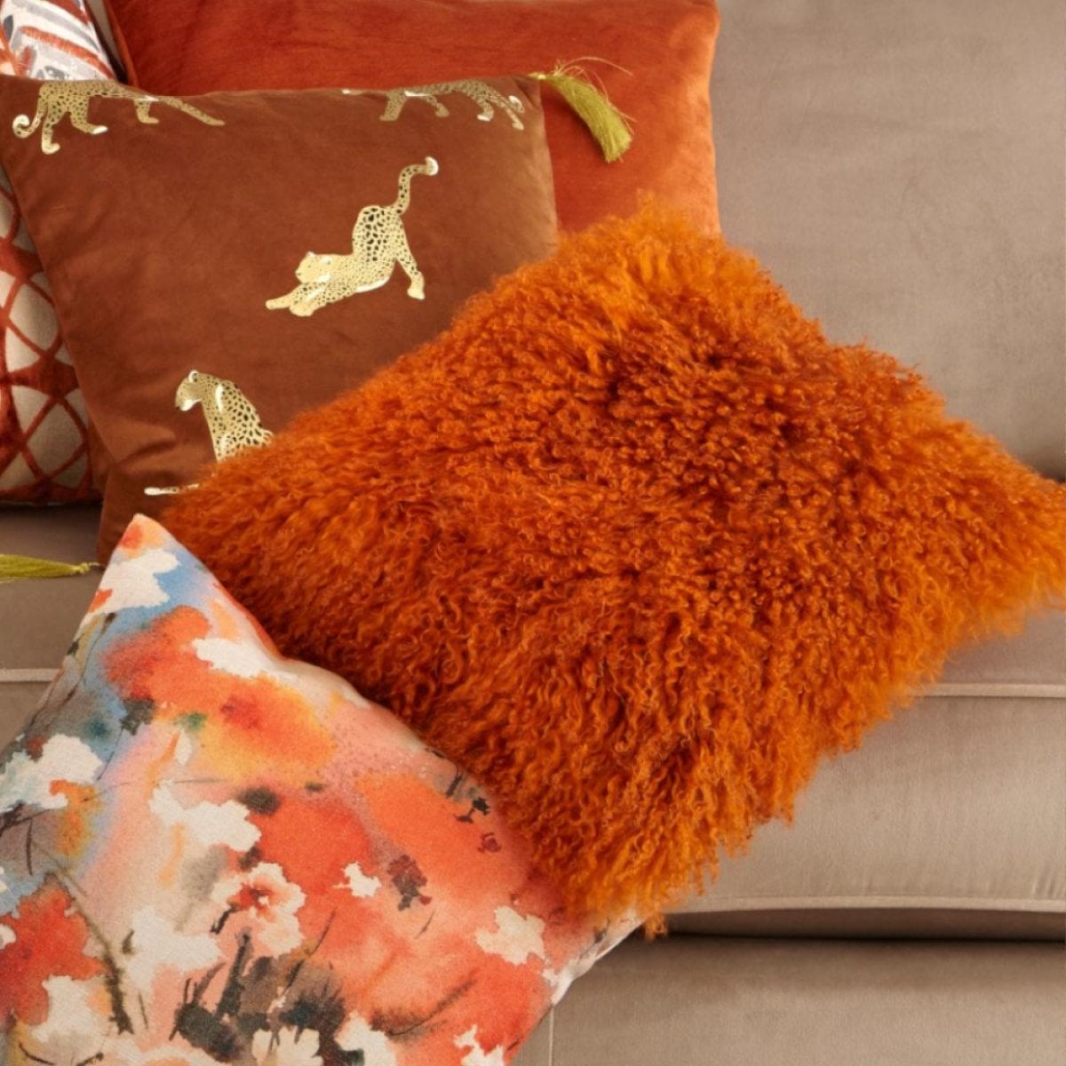 This cushion is a fantastic statement piece, thanks to its vibrant orange colour and luxe texture. I love how the Mongolian lambskin adds a tactile, cosy feel, perfect for adding warmth and personality to neutral sofas or beds. It works particularly well in contemporary interiors or boho-inspired spaces, where it can bring colour and softness effortlessly. For styling tips, try combining it with earthy tones or contrasting textures like velvet or linen for added depth. Keep the placement simple, allowing the cushion to be the focal point, and consider pairing it with other neutral or textured accessories to create a balanced, inviting look.