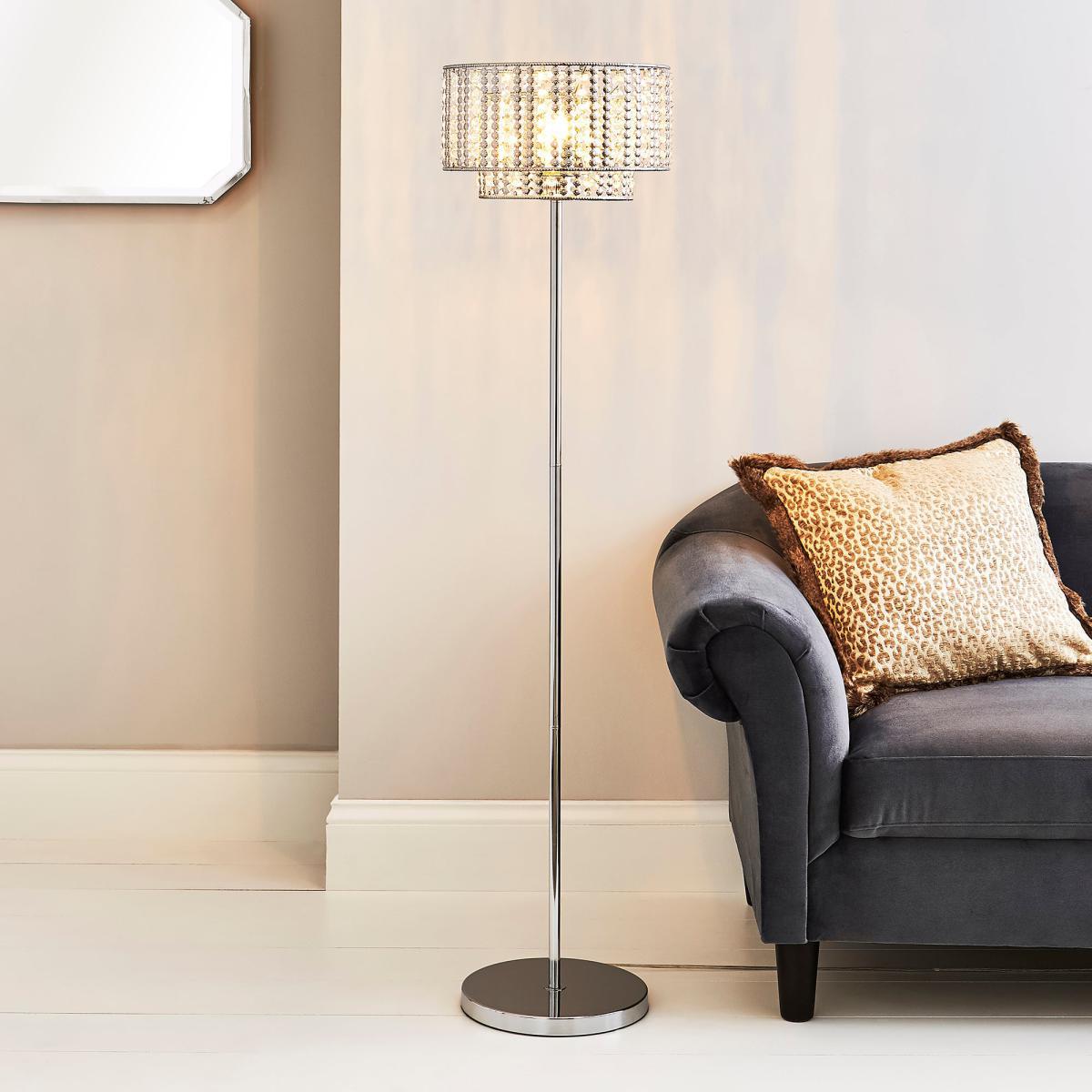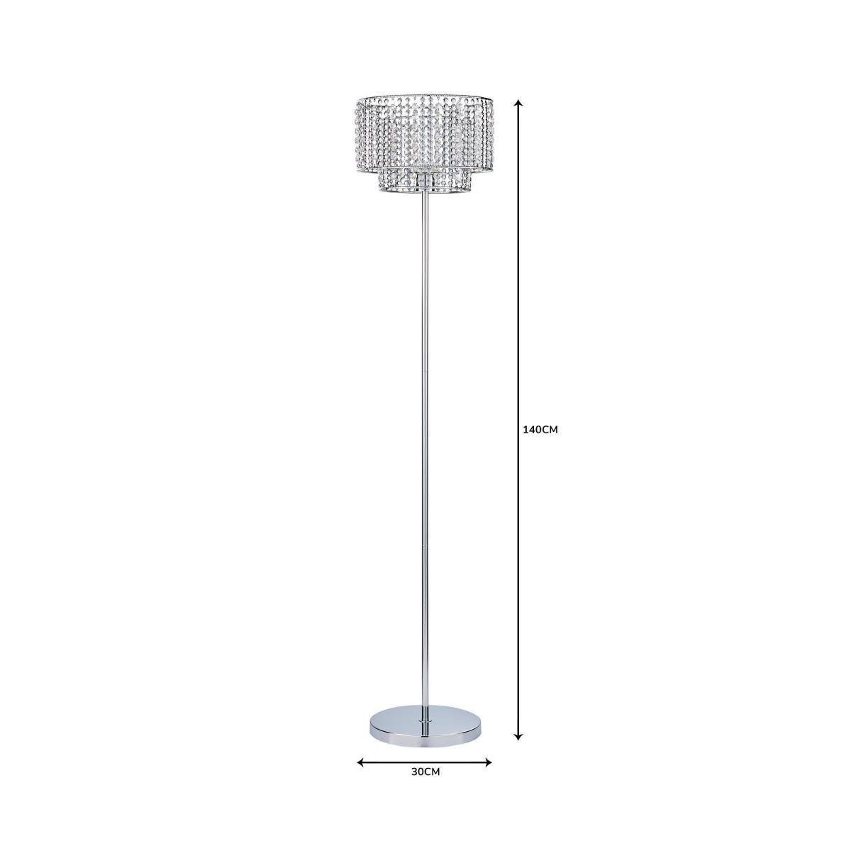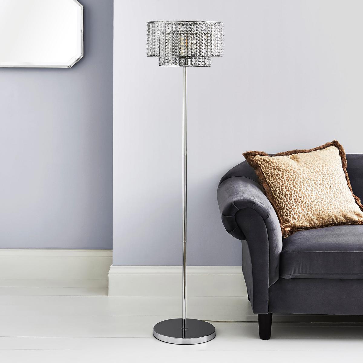 Add a stylish touch to your home with this chrome plated floor lamp. It features acrylic beads on the shade diffuser which reflect the light beautifully. Its slender shape and size means it can be used in many rooms of the home. Click. Here. To view our range of bulbs.