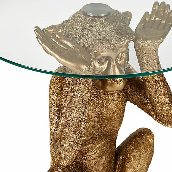 Bursting with character, the charming Monkey Side Table offers a striking, playful design, and would be a delightful centrepiece in any space. The freestanding polyresin body is finished in a brushed gold effect with a stunning engraved detailing, and comes with a tempered glass tabletop.