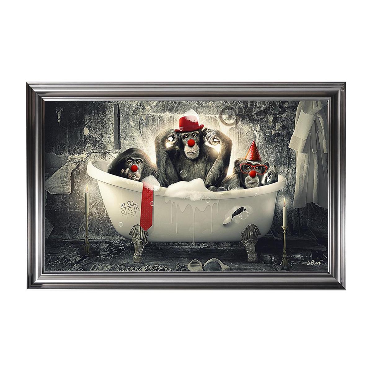 The artist of this framed art cleverly captures a comedic moment in time in glorious detail as our three wise monkeys find themselves in the bathtub. Perfect in a hallway or dining room. Why you'll love it. Everyone will love this farmed art depicting three monkeys in a soapy bathtub. Charming and witty. Monochromatic colour palette with bright red accents. Elegant metallic frame. Creative and beautifully crafted wall art. Made to order in the UK. This piece of framed art is part of the Furniture Village accessories collection. What you need to know. Indoor use only. Do not use wire or string to hang. Hanging instructions supplied with artwork. Dimensions. Height: 74 cm (30 in). Width: 114 cm (45 in).