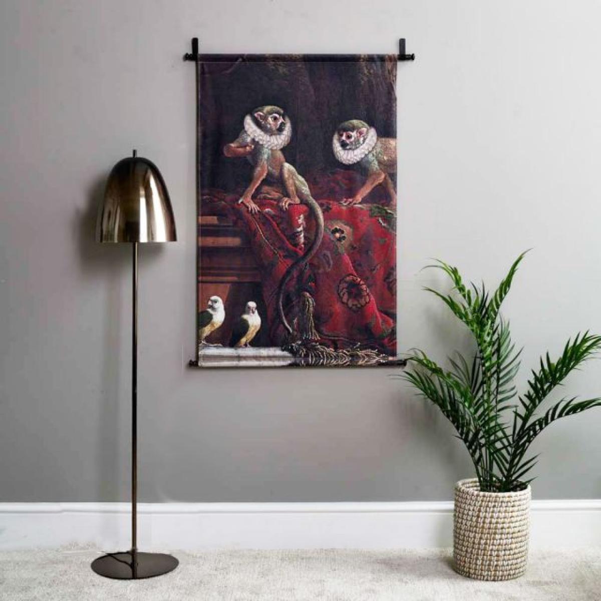 The monkeys wall hanging is a playful yet sophisticated piece that adds character to both modern and eclectic interiors. I love how it brings a touch of personality and colour without overwhelming the space. It's particularly effective in living areas or a children's room, but can also work well in a hallway or bedroom to inject some visual interest. When styling, consider placing it at eye level and pairing it with minimalist furnishings to let the artwork stand out. Pair with natural textures such as the woven basket or brass lamp seen here for a balanced, curated look. Keep surrounding decor simple and let the vivid imagery be the focal point, making this a versatile statement piece.