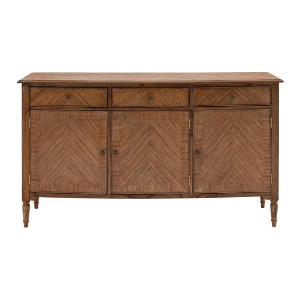 With its three cupboards and three drawers, this stunning sideboard offers an elegant storage solution. Featuring a exquisite rich mid brown finish in Mindy wood solid and veneers, the beautiful marquetry detail and Bronze finish beehive handles offer a ‘new traditional’ look, with timeless, elegant style with a modern touch. Material:Mindi / Mindi Veneer / MDF. Colour/Finish: Peroba.