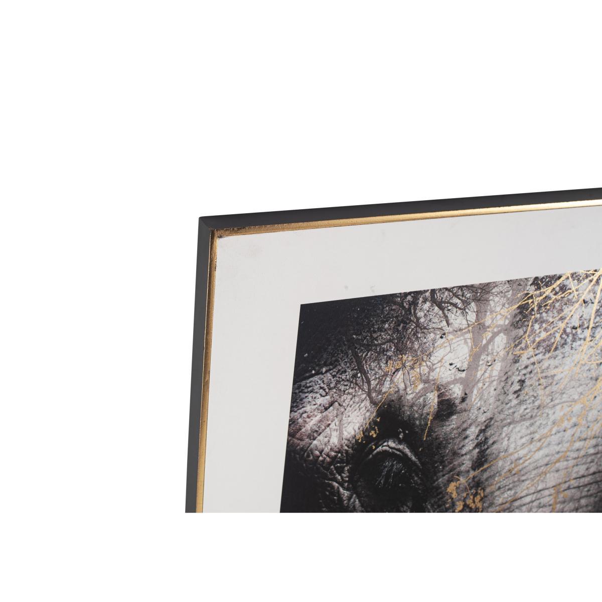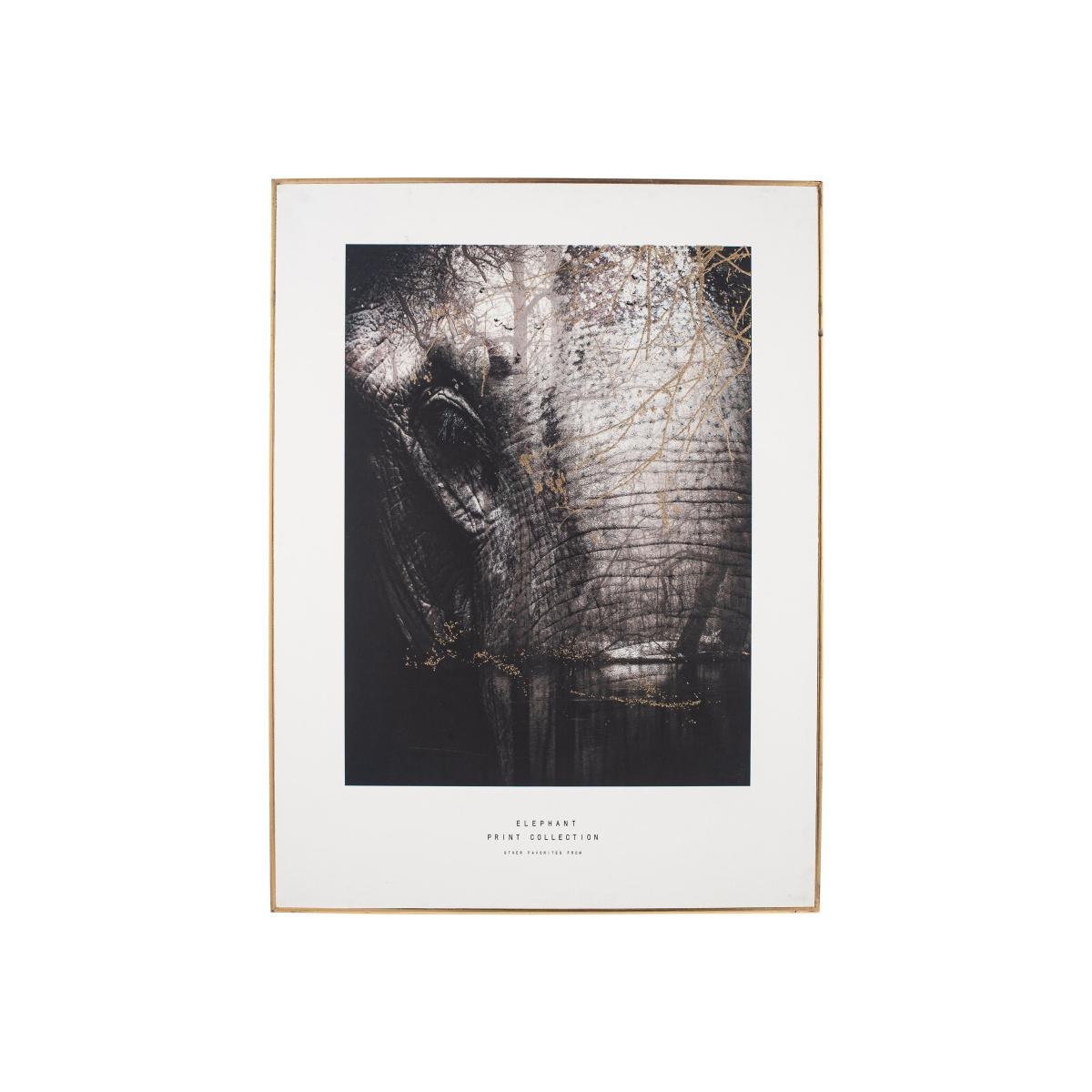 This monochrome print features a powerful closeup of the majestic elephant. It’s an elegant expression of wildlife that has a captivating gold leaf detail for extra impact. Why you'll love it. Monochrome art with a statement feel. Impactful design for an elegant interior. Captivating gold leaf detail. Luxuriously enclosed in a black and gold frame. Printed on high-quality paper. What you need to know. A paper print on an MDF backboard. Make sure the wall you hang your art on can support it. Dimensions. Height: 80 cm (31 in). Width: 60 cm (23 in).