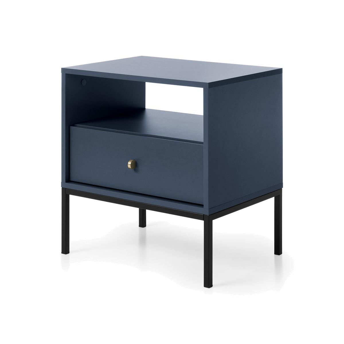 I love this dark-blue side table for its crisp, minimalist form and handy combination of open shelf plus a single drawer - it’s perfect for modern, Scandinavian or mid-century inspired rooms. The deep hue pairs beautifully with soft neutrals or mustard accents, and the slim black legs give it a slightly lifted, airy feel. For styling, try a small table lamp or sculptural vase on top and use the shelf for a neat stack of books or magazines. Hide chargers or remotes in the drawer to keep surfaces clear, and position it beside a cream armchair or by the bed to anchor the corner without overwhelming the space.