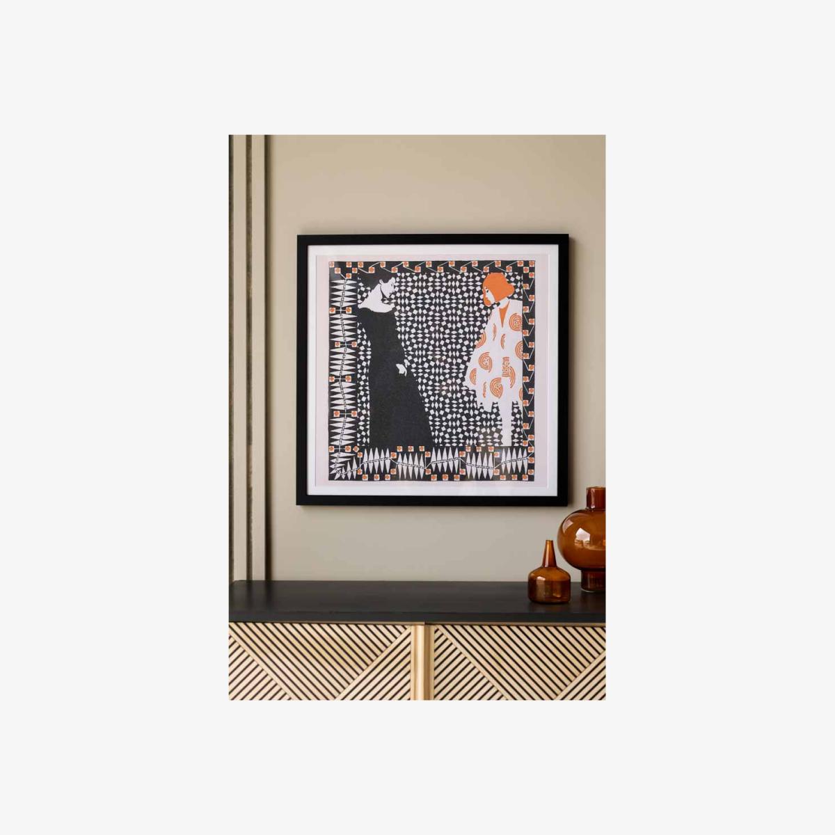 About The Monochrome Beauties Art Print A beautiful piece of art that introduces, colour, pattern and abstract style to your walls, the Monochrome Beauties Art Print is one of our all-time favourite additions to the RSG art print shop! Available either framed or unframed, the unframed version measures 50cm x 50cm, whilst the black wood frame option measures 54cm x 54cm. Why We Think You’ll Love The Abstract Art Print As a fine art print of a work by a renowned Austrian graphic artist who rose to fame in the twentieth century, the Monochrome Beauties Art Print has a truly timeless feel and is as captivating and contemporary now as when it was first created. Featuring two gorgeous female figures against an asymmetric chequerboard background with unique geometric detailing, this stunning wall art design adds a sense of wonder to your walls and is a favourite of RSG Co-founder Jane Rockett! Embracing a monochrome colour palette with a pop of bright orange, this is the perfect piece of affordable art to transform your home with the magic of monochrome. How To Style The Monochrome Art Print The Monochrome Beauties Art Print has the power to make a statement when styled solo or alongside other art from your collection. Style yours above a console table in the living room or introduce to a gallery wall of gorgeous monochrome art prints for the ultimate expression of colour and creativity!
