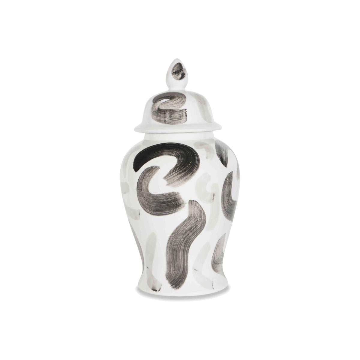 This large ginger jar is just beautiful. Made of ceramic and finished with a high-gloss glaze, its monochromatic brushstroke design is both modern and timeless. Why you'll love it Beautiful ceramic ginger jar looks beautiful on a mantlepiece or shelf. Modern decorative style in ceramic. Classic curved silhouette. Minimalist monochromatic white, grey and black colour palette. Simple brushstroke embellishment. Finished with a high-shine glaze. With a removable lid, this piece can be used as a storage jar. This large ginger jar is part of the Furniture Village home accessories collection. What you need to know Ceramic. To clean, simply dust with a soft cloth. Avoid wax-based cleaning products. Dimensions Height: 46 cm (19 in). Diameter: 24 cm (10 in).