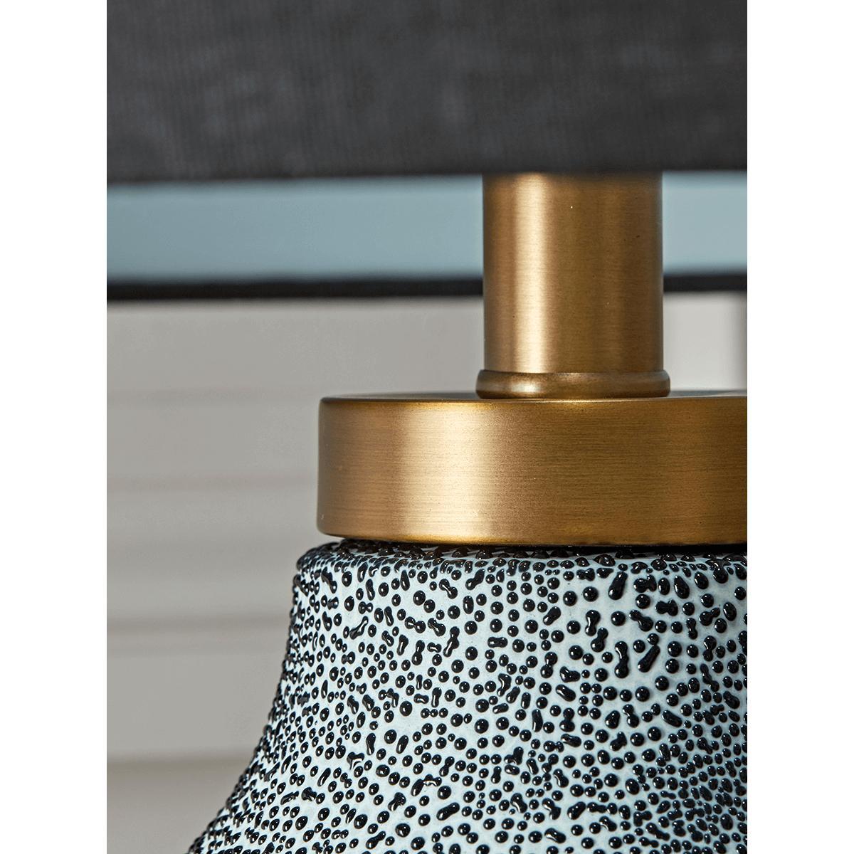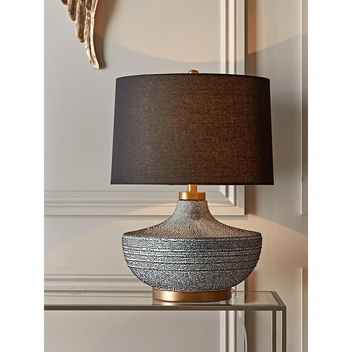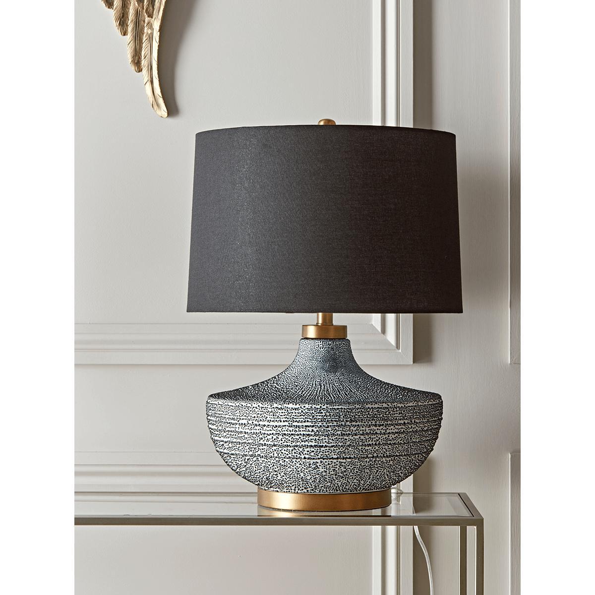 Our Faded Elegance trend captures the drama and romance of old-world grandeur - and our table lamp here perfectly captures the mood. The statement monochrome base with speckles to the glaze has an eye-catching form that is balanced nicely by the generous black linen barrel shade. A gold plinth and stem complete the piece. Position on your hallway console to make more of your entrance, or to an alcove to realise its potential!. Discover how to create the perfect lighting scheme for your home using our. Lighting Buying Guide.