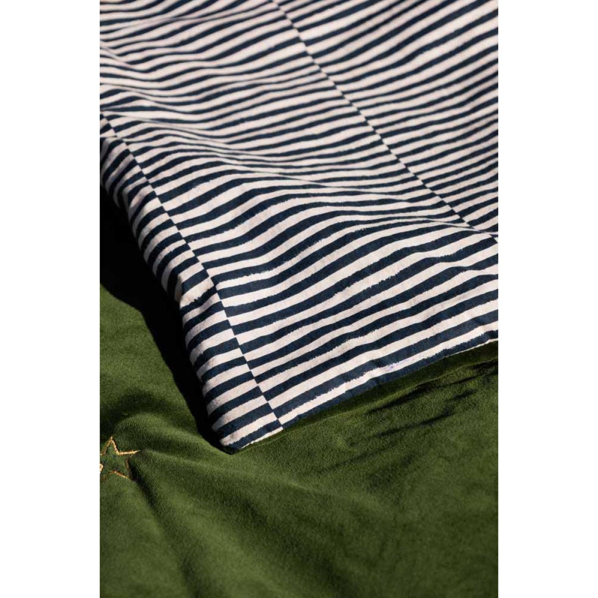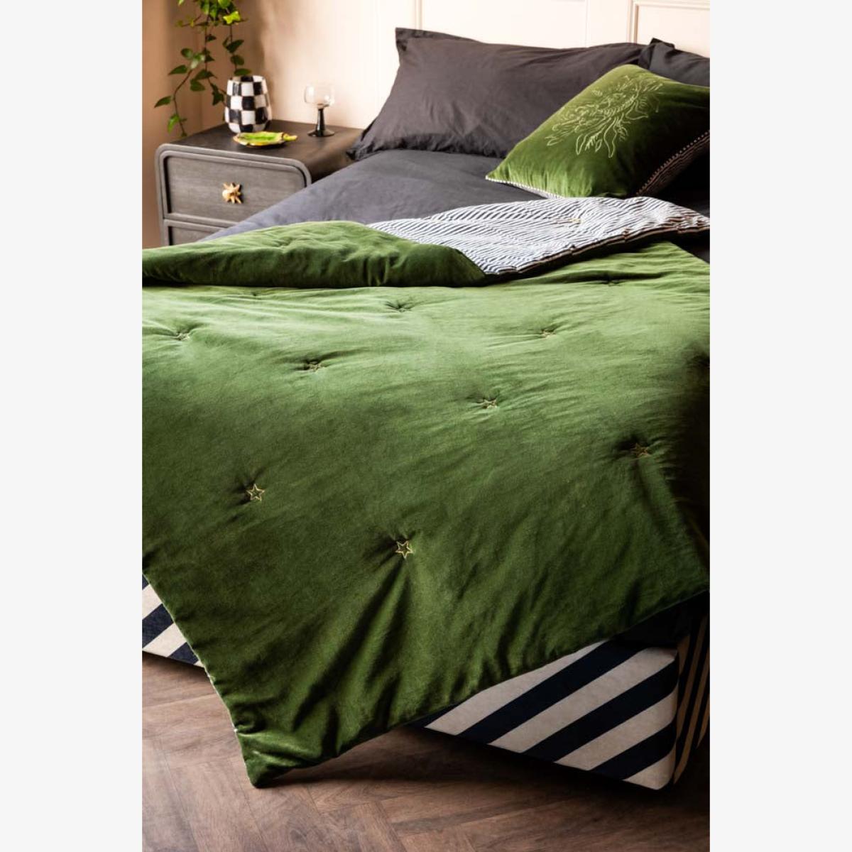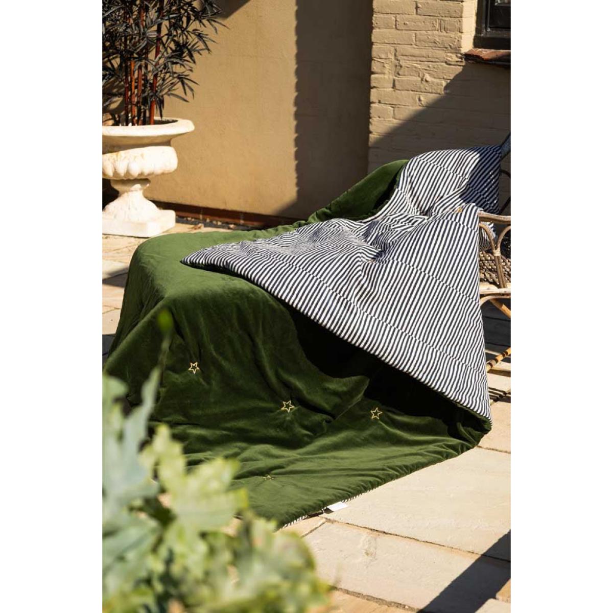<!--td -- > Say hello to the Stripe Throw with Green Velvet Reversible Quilt. One side boasts perfectly imperfect monochrome stripes, which are effortlessly cool, endlessly stylish and just the right amount of bold. Flip it over, and suddenly you’re wrapped in the richest green velvet, sprinkled with delicate gold embroidered stars for that extra touch of magic. It’s opulent yet playful, chic yet cosy – basically, it’s everything you want in a bed cover. Drape it over your bed for instant drama, style it on your sofa for a casual but make-it-fancy vibe, or snuggle up with it amongst your other soft furnishings and bedding. Whether you’re feeling sleek and striped or velvety and luxe, this bedspread lets you choose your own adventure. Why settle for one vibe when you can have two? - Monochrome Stripe & Green Velvet Reversible Quilt - Measures: W130cm x L190cm - Materials: Cotton & Velvet - Wipe clean with dry cloth only
