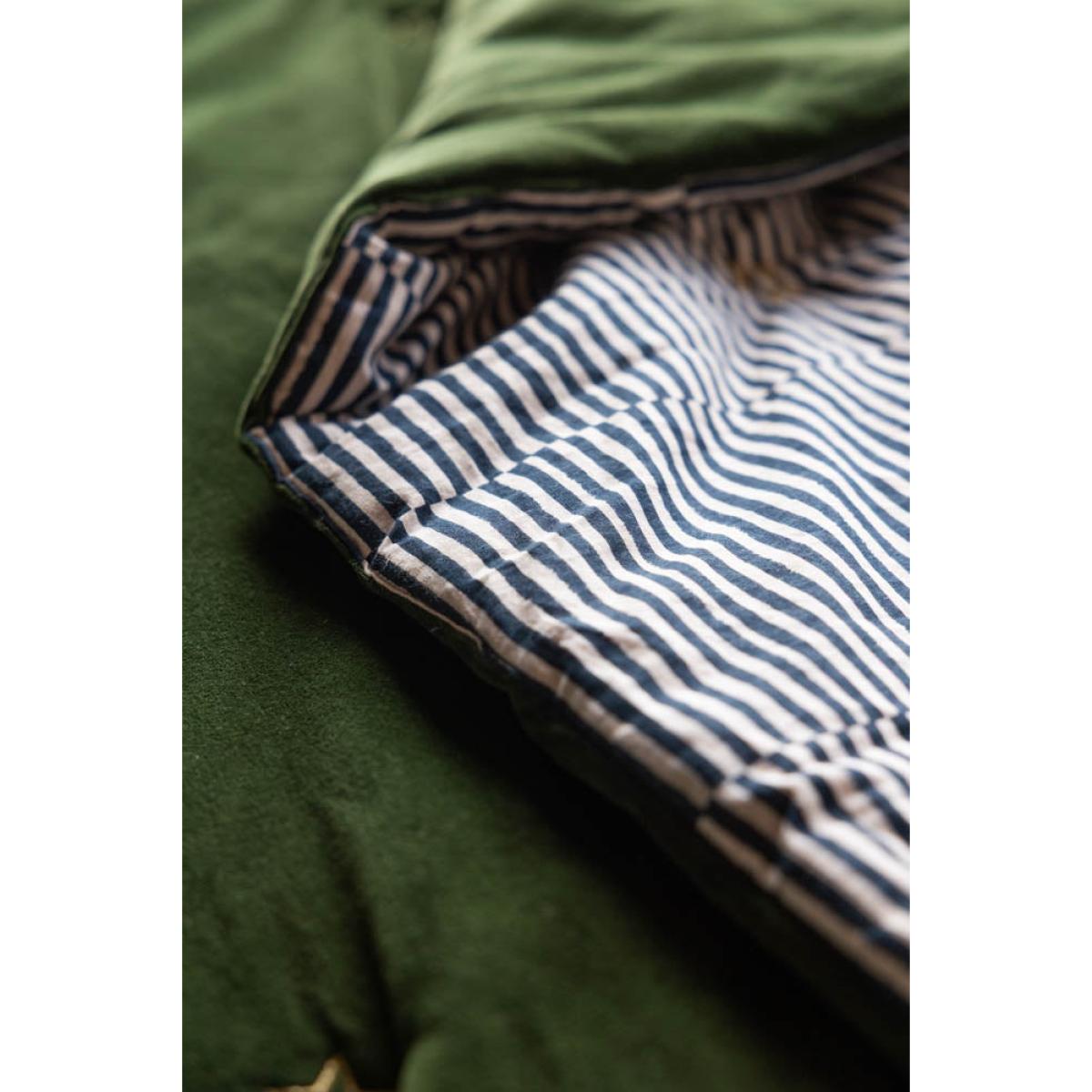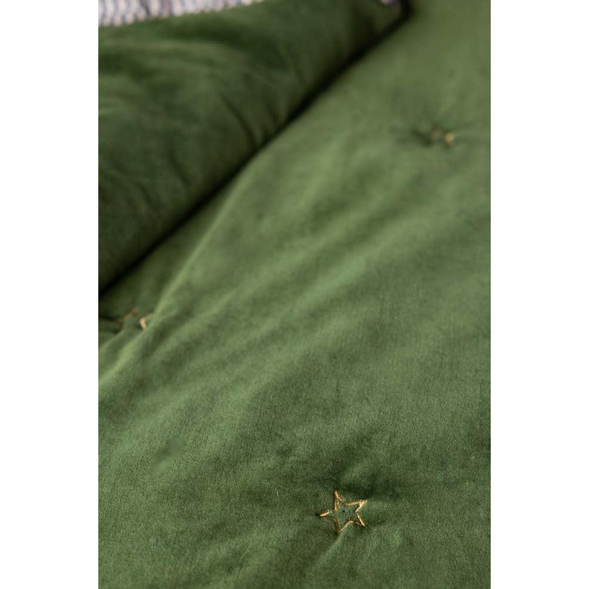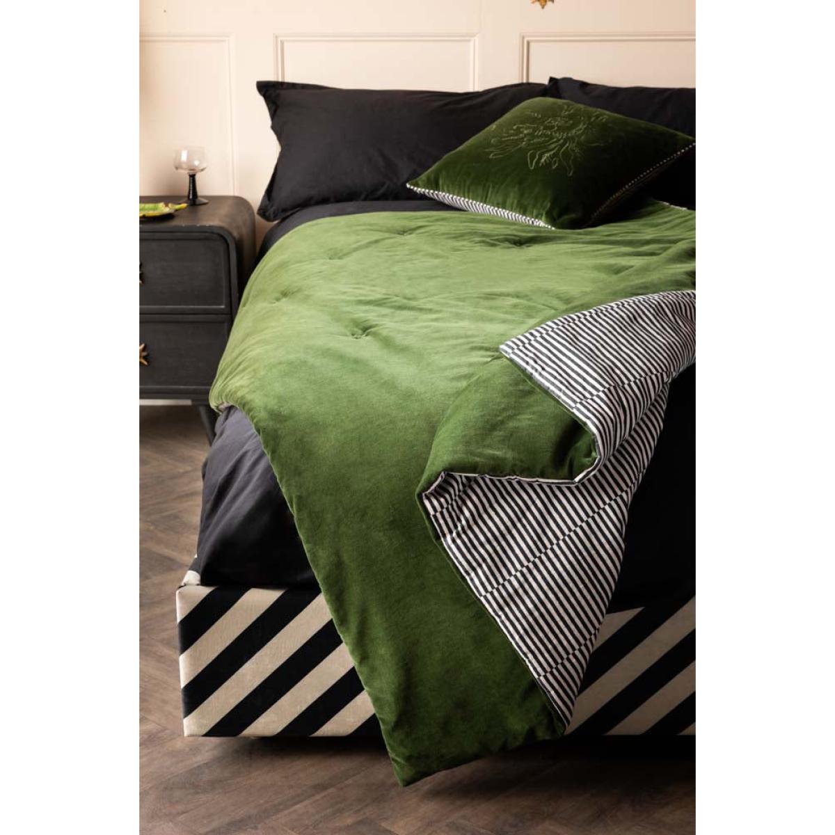 <!--td -- > Say hello to the Stripe Throw with Green Velvet Reversible Quilt. One side boasts perfectly imperfect monochrome stripes, which are effortlessly cool, endlessly stylish and just the right amount of bold. Flip it over, and suddenly you’re wrapped in the richest green velvet, sprinkled with delicate gold embroidered stars for that extra touch of magic. It’s opulent yet playful, chic yet cosy – basically, it’s everything you want in a bed cover. Drape it over your bed for instant drama, style it on your sofa for a casual but make-it-fancy vibe, or snuggle up with it amongst your other soft furnishings and bedding. Whether you’re feeling sleek and striped or velvety and luxe, this bedspread lets you choose your own adventure. Why settle for one vibe when you can have two? - Monochrome Stripe & Green Velvet Reversible Quilt - Measures: W130cm x L190cm - Materials: Cotton & Velvet - Wipe clean with dry cloth only
