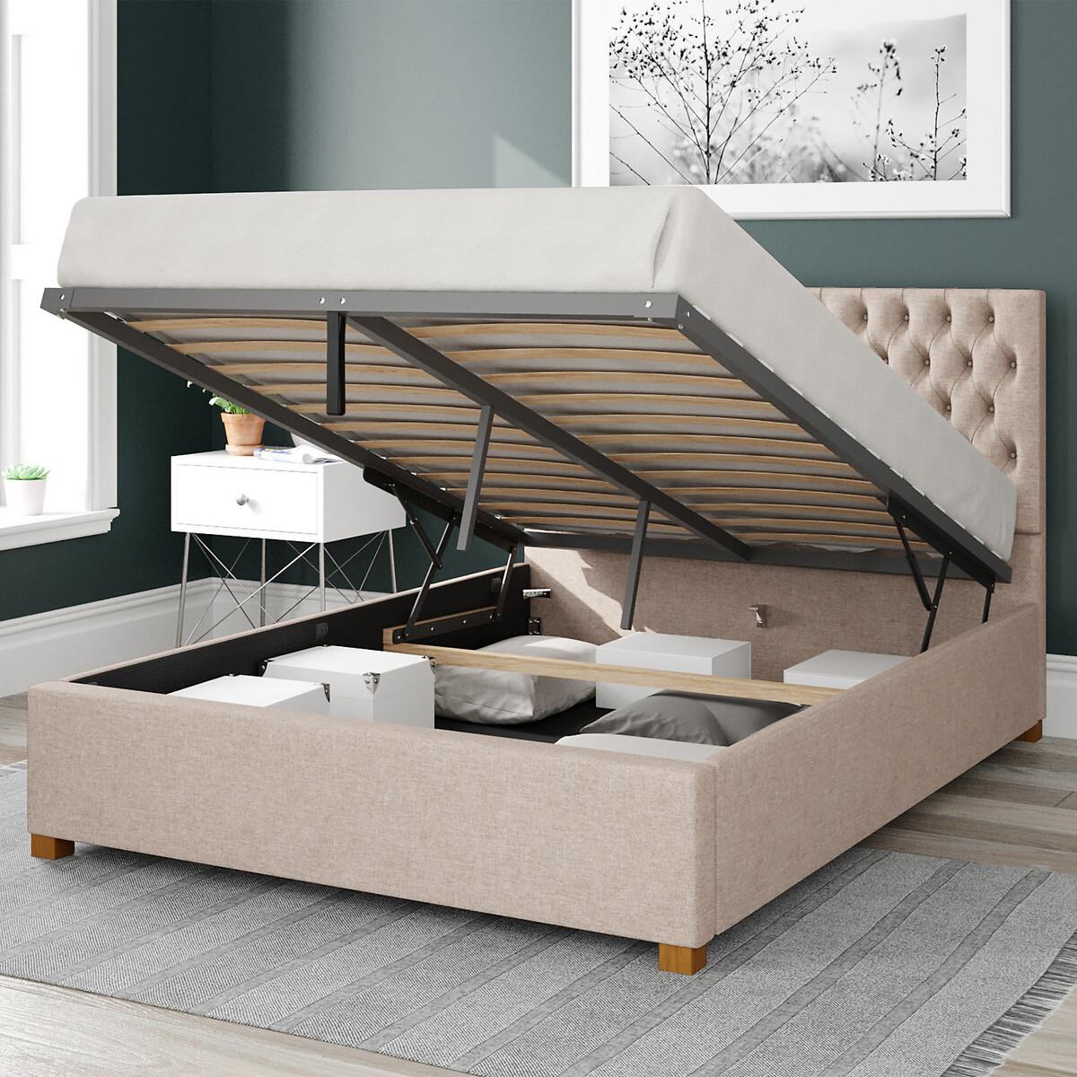 Monroe Herringbone Twill Storage Ottoman Bed with Chesterfield Upholstered Headboard