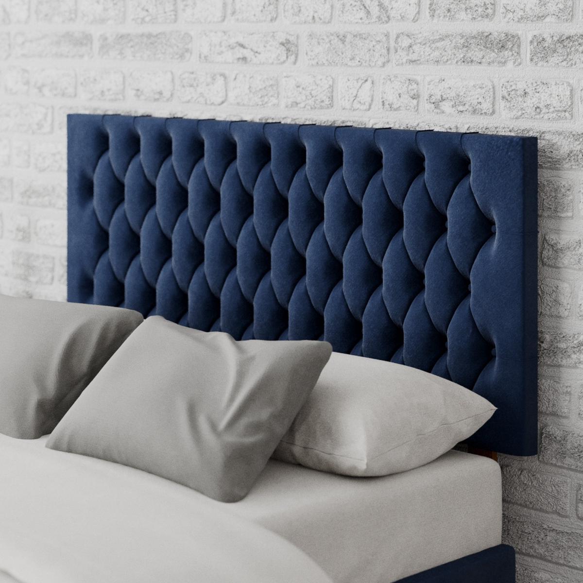 * Manufactured in the UK* Beautiful, chesterfield inspired headboard design* Hand upholstered with deep padding* Solid mahogany struts* 60cm headboard panel height * Compatible with standard size UK bed bases and divans The plush texture of this velvet headboard will help to add depth and sophistication into your bedroom. The Monroe Fabric Headboard exudes style with its hand-finished, intricate details. The elegant deep padded headboard features a Chesterfield inspired design and handmade fabric buttons. The headboard is sure to complement your home décor whether that be traditional or contemporary. With a choice of colour options, you are sure to find the best one to suit your bedroom style. Handcrafted, this headboard features a 15mm thick wooden panel that has been supplied with strong mahogany struts to ensure sturdiness once installed. You can sit up and read a book in bed with comfort as the headboard has a comfortable 40mm deep polyester padding. The hard-wearing, supple fabrics are designed to withstand long term use. Aspire take great care in constructing their headboards from start to finish. They take pride in their precision work which shows in the fabulous finish and intricate design details of their headboards. The headboards are available from single to super king sizes, and it is suitable for all standard bed bases.