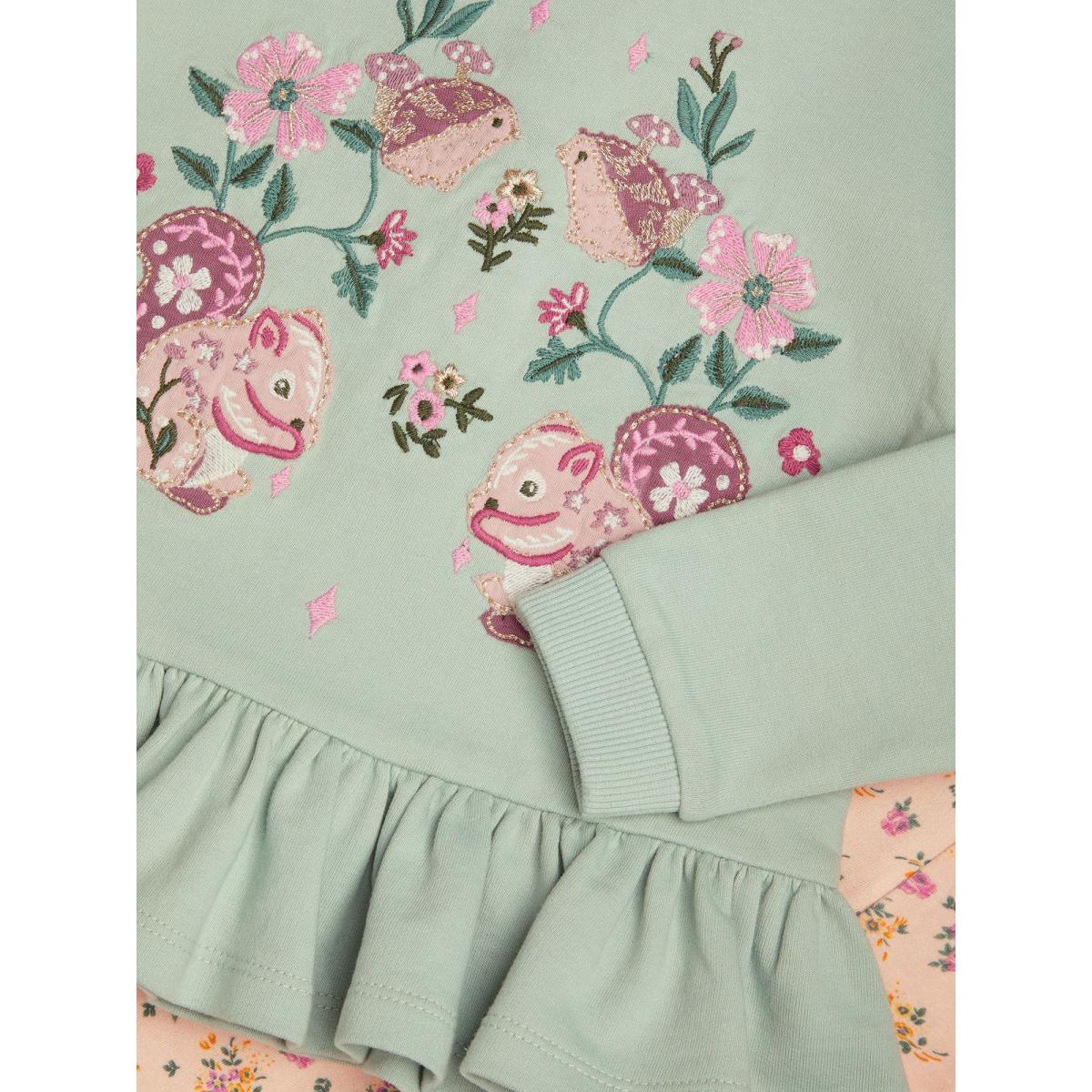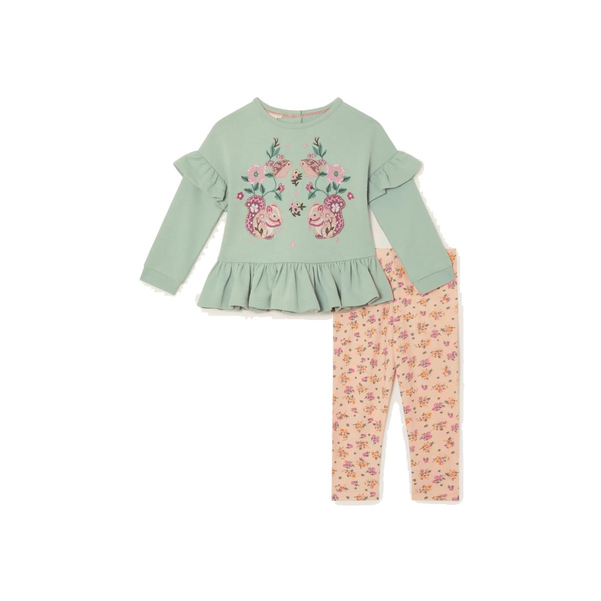 I love this cute set for adding a soft, playful touch to a baby's wardrobe. The gentle green hue and charming animal appliqué make it versatile enough to complement a nursery with pastel accents or woodland-themed decor. It works well in cosy interiors with light woods, rattan accents, or soft textiles, creating a calming environment. Practical styling tips include pairing it with neutral knitted blankets or a simple cotton sleepsuit for easy layering, and keeping accessories minimal to focus on the eye-catching details of the top. It’s perfect for casual days out or comfortable stay-at-home moments, seamlessly blending practicality with adorable style.