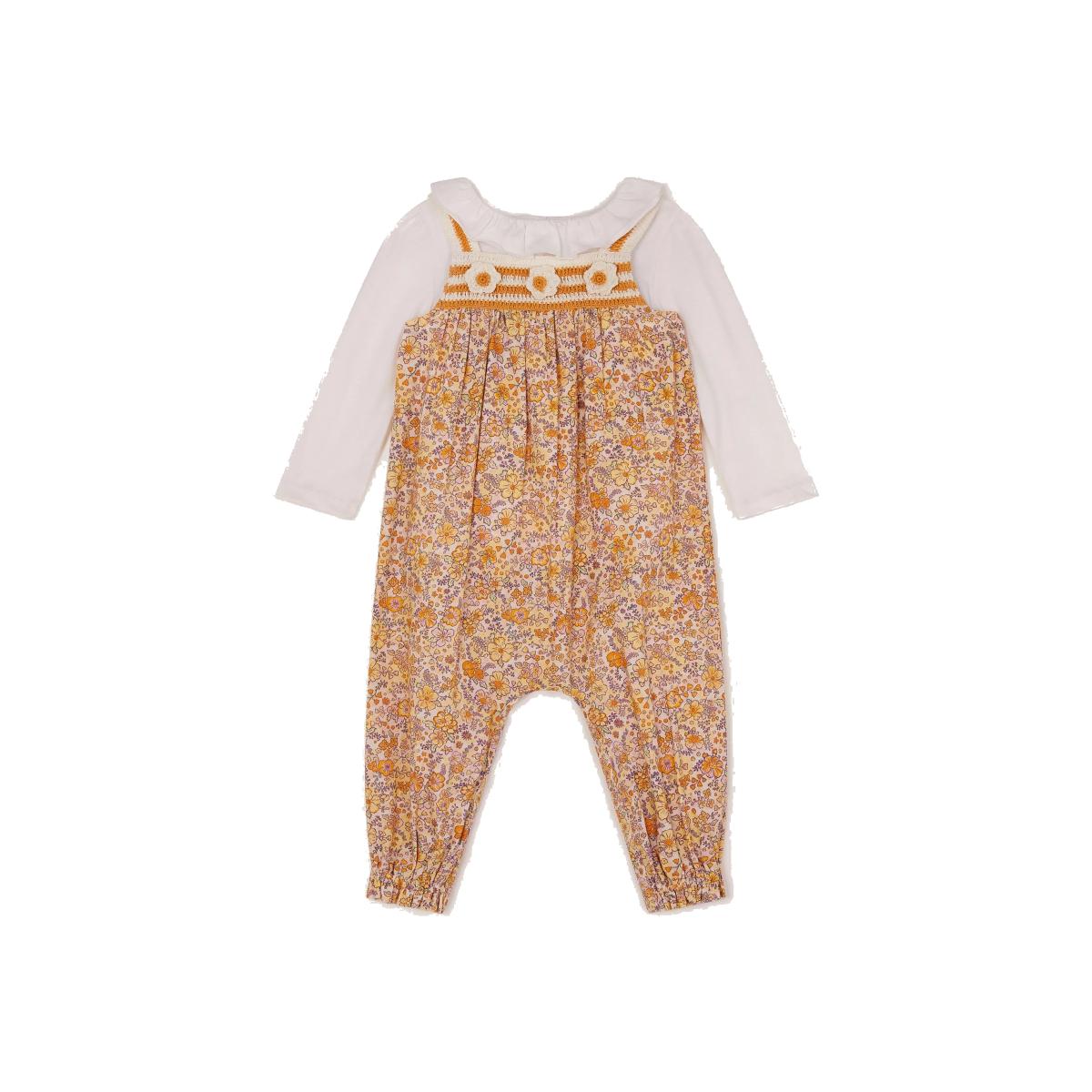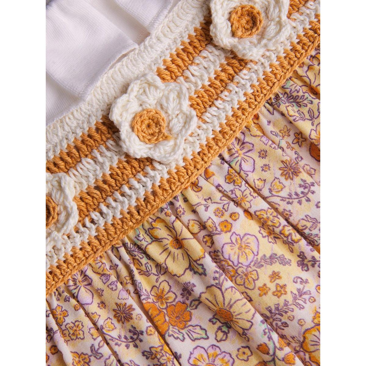 Retro style with a 70s-inspired colour palette, this set includes a white frilly blouse and a romper decorated with ditsy buttercup blooms and crochet flowers. Finished with button fastenings at the back.