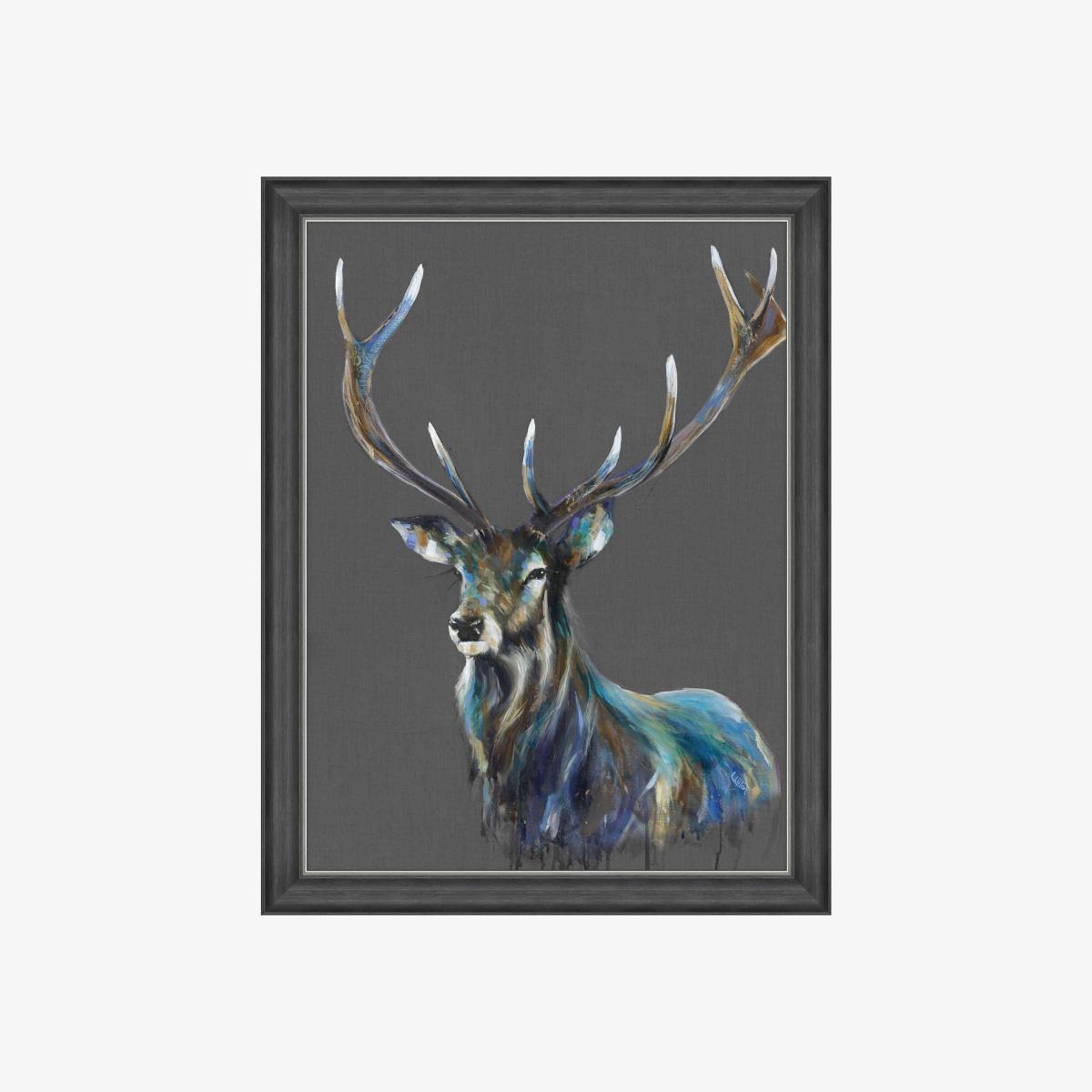 A stunning piece of framed art depicting a technicolour stag in a breathtaking composition. The perfect addition to the contemporary home. Why you'll love it A vibrant and visually arresting modern artwork. A gorgeous palette of greys, blues and greens. Reproduced from original artwork by Louise Luton. Elegantly framed in a sleek grey and silver frame. Made in the UK. This framed picture is part of the Furniture Village home accessories collection. What you need to know Supplied with a metal hanging fitting and nylon cord. Indoor use only. Dimensions Height: 113cm (45 in). Depth: 3 cm (1 in). Width: 87 cm (35 in).