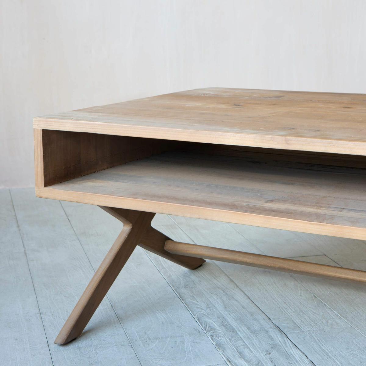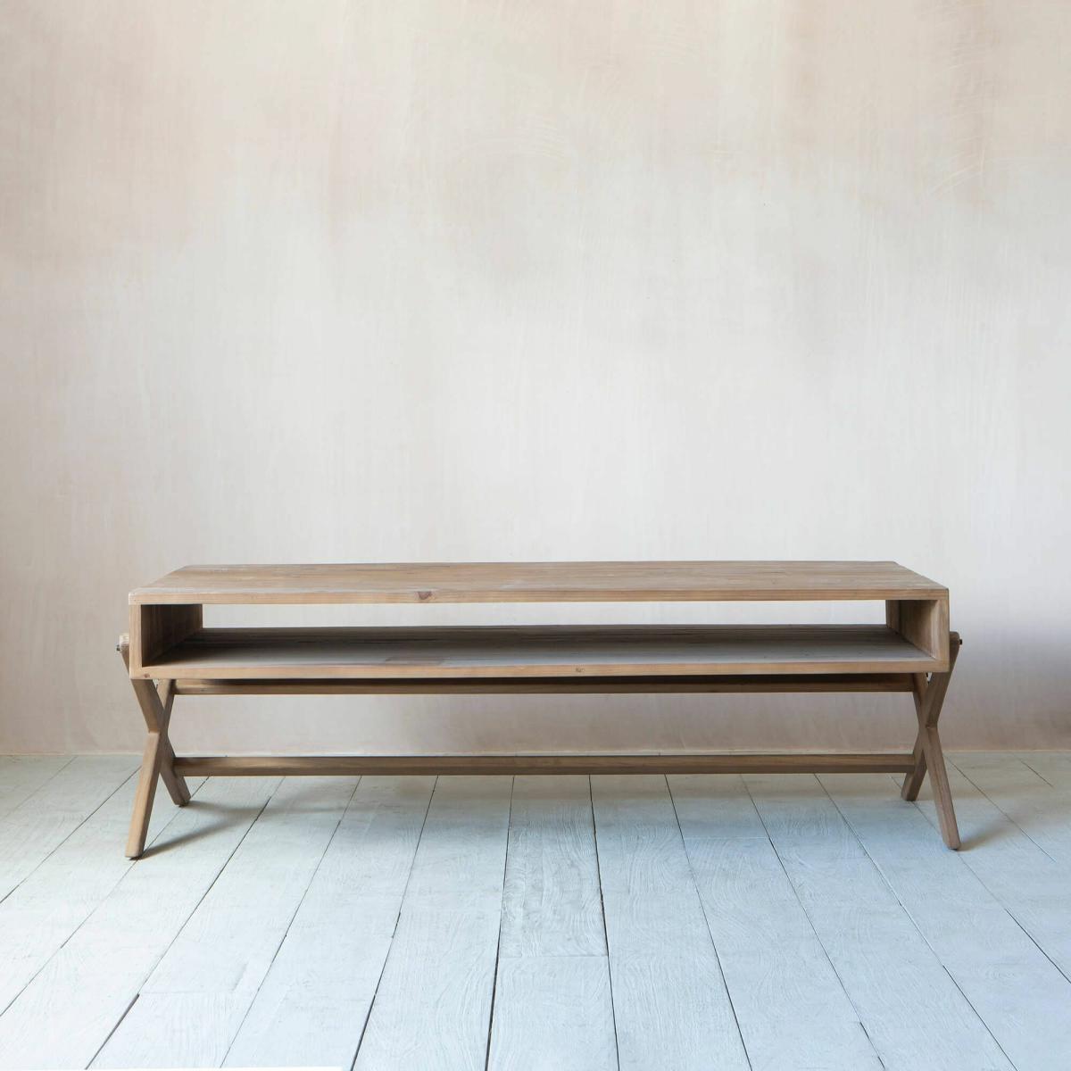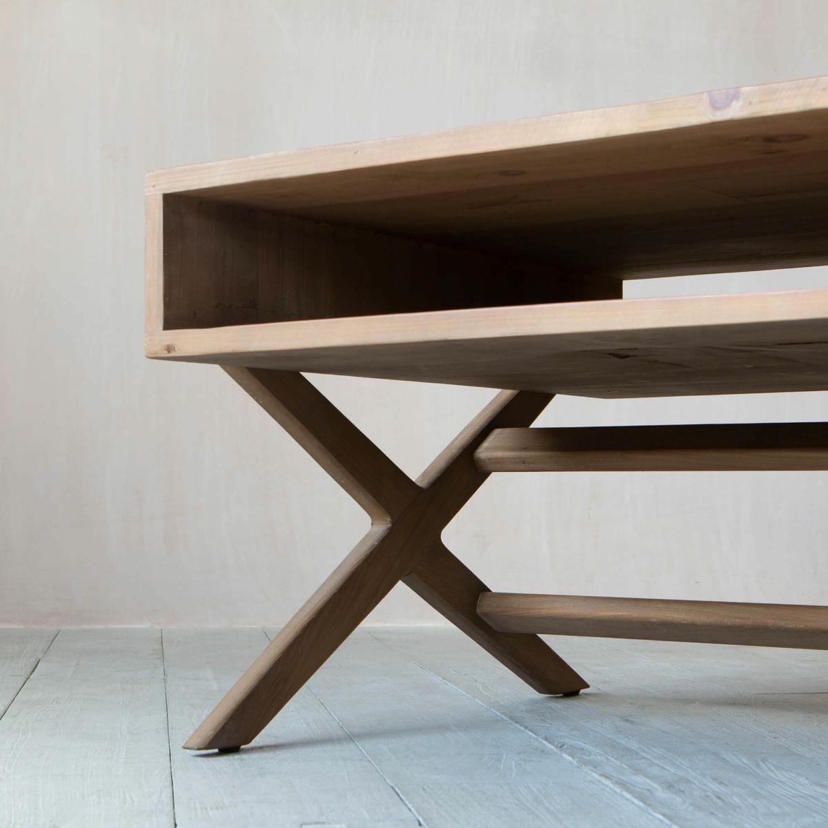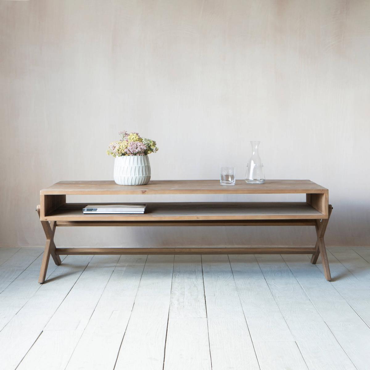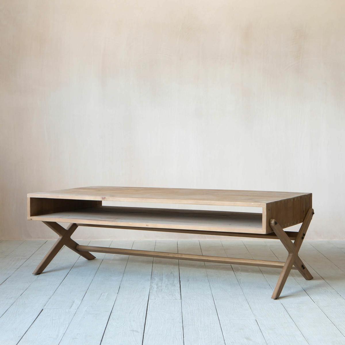 A mid-century coffee table with a wooden shelf and crossed legs, pair with a velvet sofa and seventies inspired accessories for a retro look.