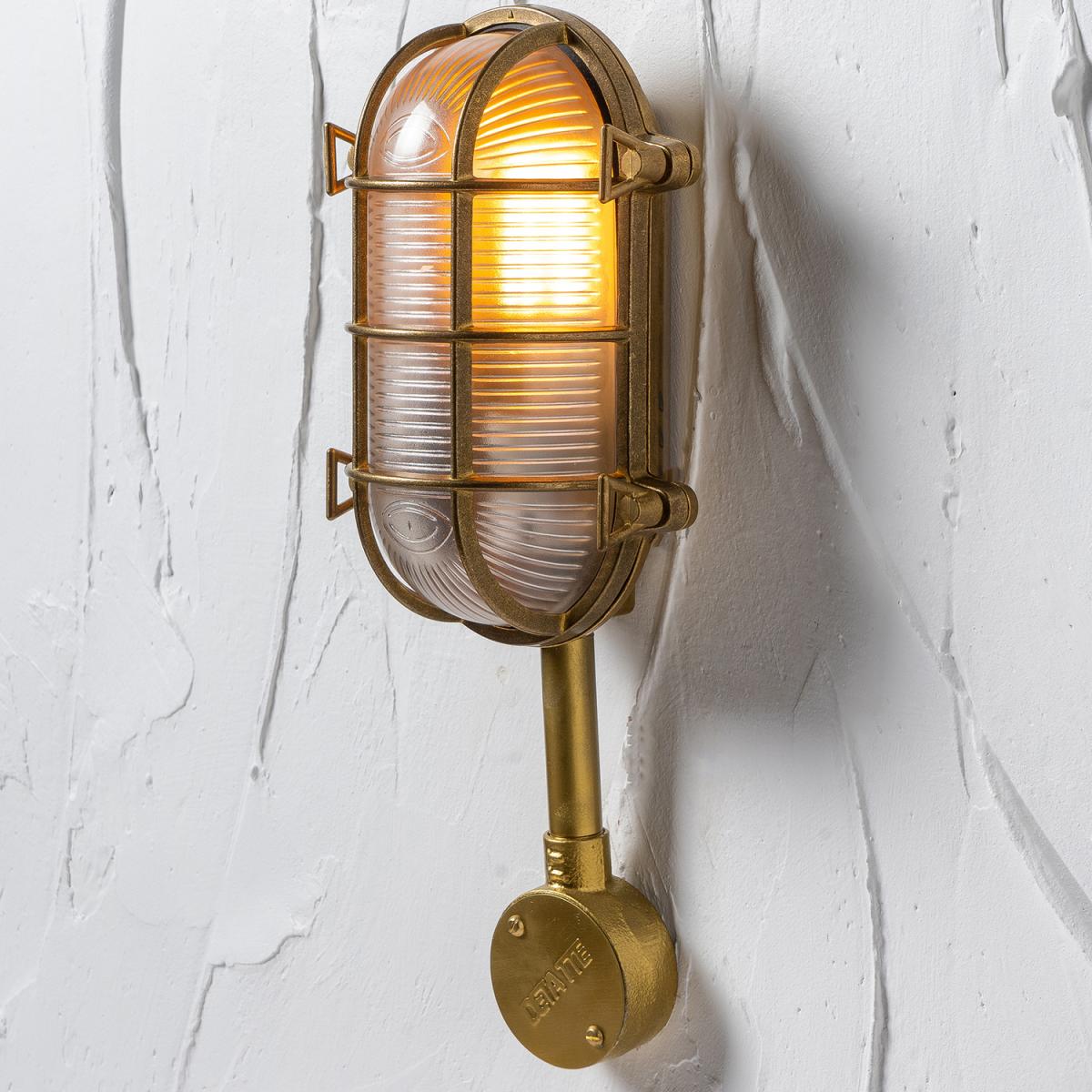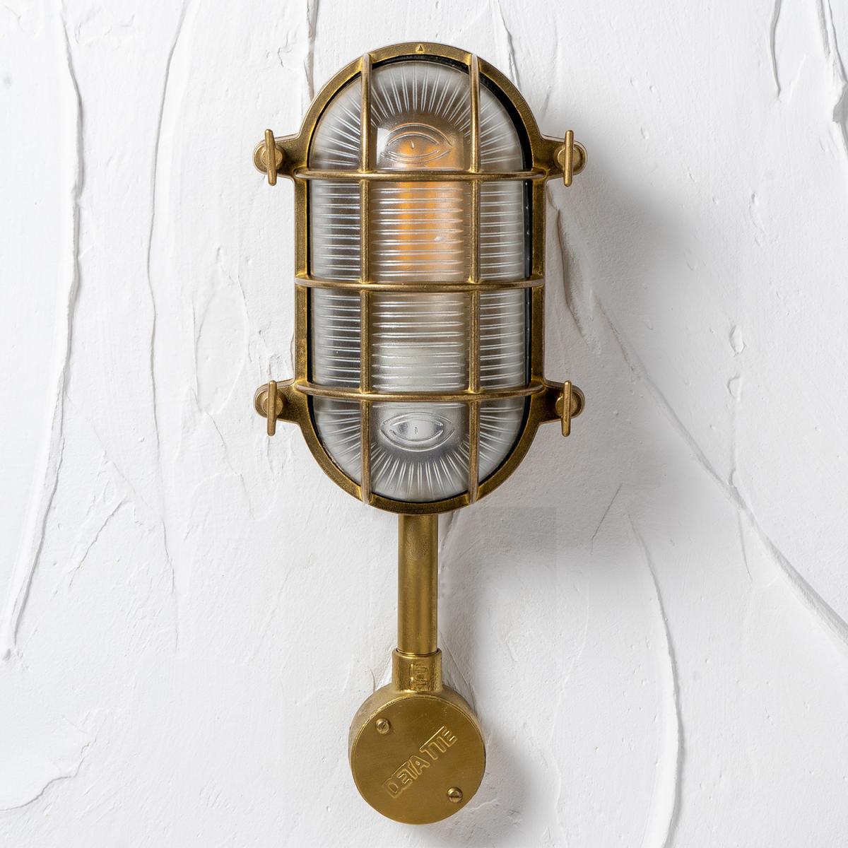 Our bunker style outdoor wall light is the perfect addition for a shady spot that needs plenty of light. The textured glass front is protected by a metal cage and finished in an antique brass colouring. Line up along a wall or place either side of a door to illuminate the way.