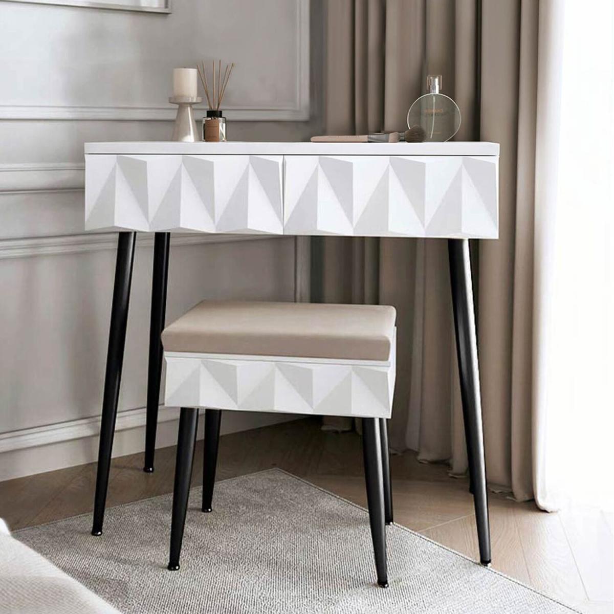 Montana is a sophisticated and contemporary dressing table set that effortlessly brings a touch of style and contemporary charm to any bedroom or dressing room. This striking vanity table set showcases a contemporary geometric design, adding a fresh and on trend aesthetic to your space. Montana features two spacious storage drawers which is perfect for having all your beauty products to hand. A luxury padded stool is included, with a champagne-coloured cushioned velvet fabric for added comfort, the stool can be neatly tucked away under the dressing table. The stool features a geometric pattern, and the lift-up lid reveals additional storage space. Montana will elevate your interior and blend seamlessly with your decor.