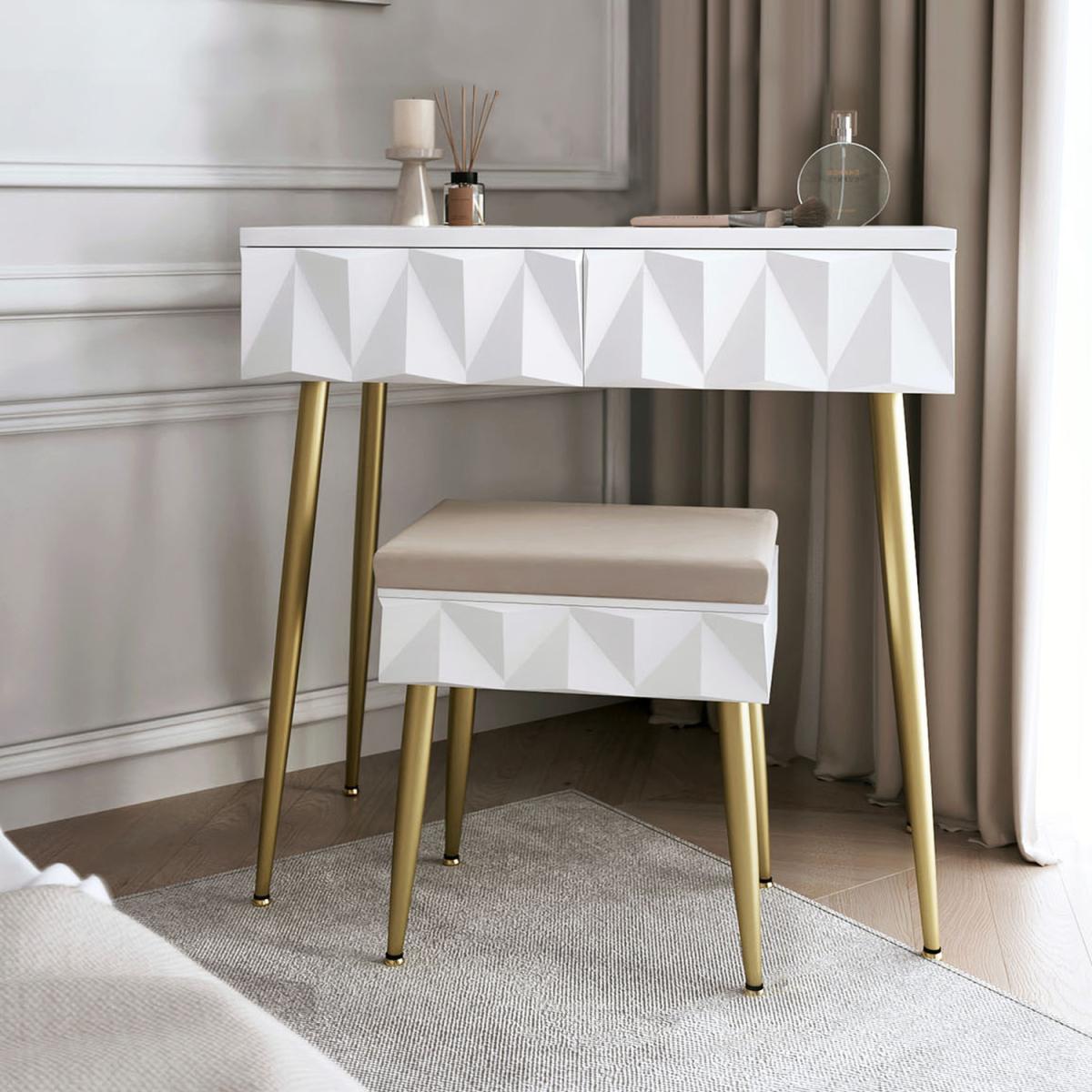 Montana is a sophisticated and contemporary dressing table set that effortlessly brings a touch of style and contemporary charm to any bedroom or dressing room. This striking vanity table set showcases a contemporary geometric design, adding a fresh and on trend aesthetic to your space. Montana features two spacious storage drawers which is perfect for having all your beauty products to hand. A luxury padded stool is included, with a champagne-coloured cushioned velvet fabric for added comfort, the stool can be neatly tucked away under the dressing table. The stool features a geometric pattern, and the lift-up lid reveals additional storage space. Montana will elevate your interior and blend seamlessly with your decor.