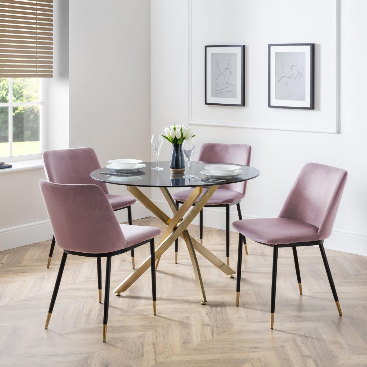 The Montero 4 Seater round dining table is a versatile and contemporary piece that works well in both modern and eclectic interiors. I love how the gold top adds a subtle luxe feel without overpowering a space, making it suitable for both neutral and more colourful schemes. Its round shape encourages social interactions and makes it perfect for compact dining areas. For styling, pair it with soft pastel or muted chairs, like the blush pink ones in the example, to create a balanced and inviting look. To add visual interest, consider layering with textured tableware or greenery, and keep the surroundings minimal to let the table be the focal point. It’s a practical choice that elevates the look of any dining space.