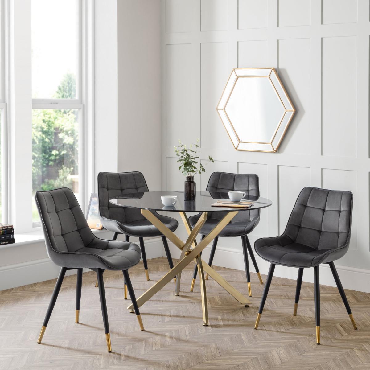 Gatsby called - he wants his dining set back. Dine in style and class with this Minori dining set, featuring a luxe mix of velvet, gold-effect finish, and smoked glass that's sure to wow you and your guests day in and day out. Tempered glass and sturdy steel make for a durable construction sure to stay with you for years, so you don't have to worry about having to part with such a stylish piece!.